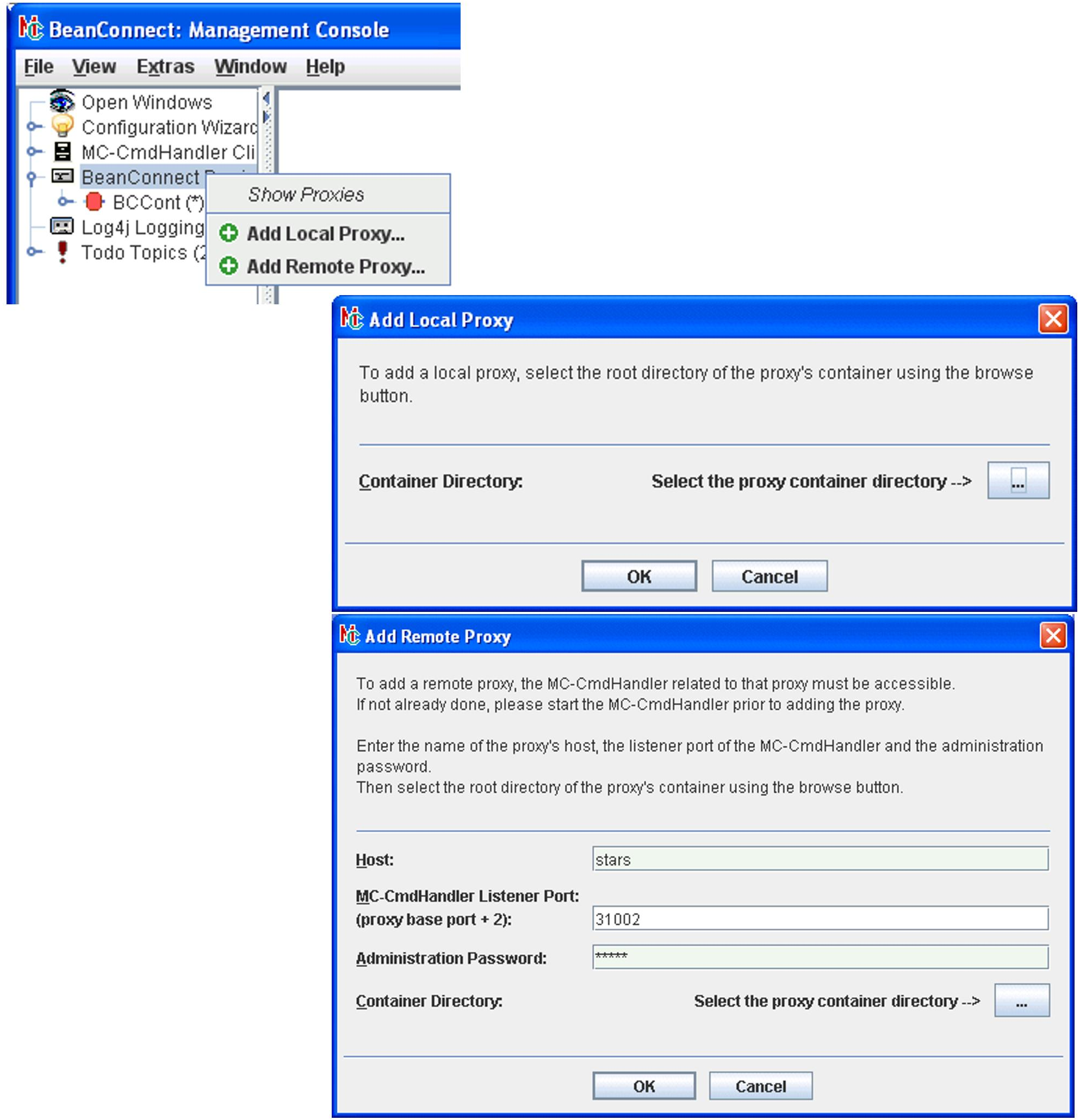 A proxy, installed beneath the same BeanConnect home directory as the Management Console, will be detected the next time the Management Console is started and will be added to the configuration data automatically. This also applies if the proxy is installed on the system after the Management Console has been installed.