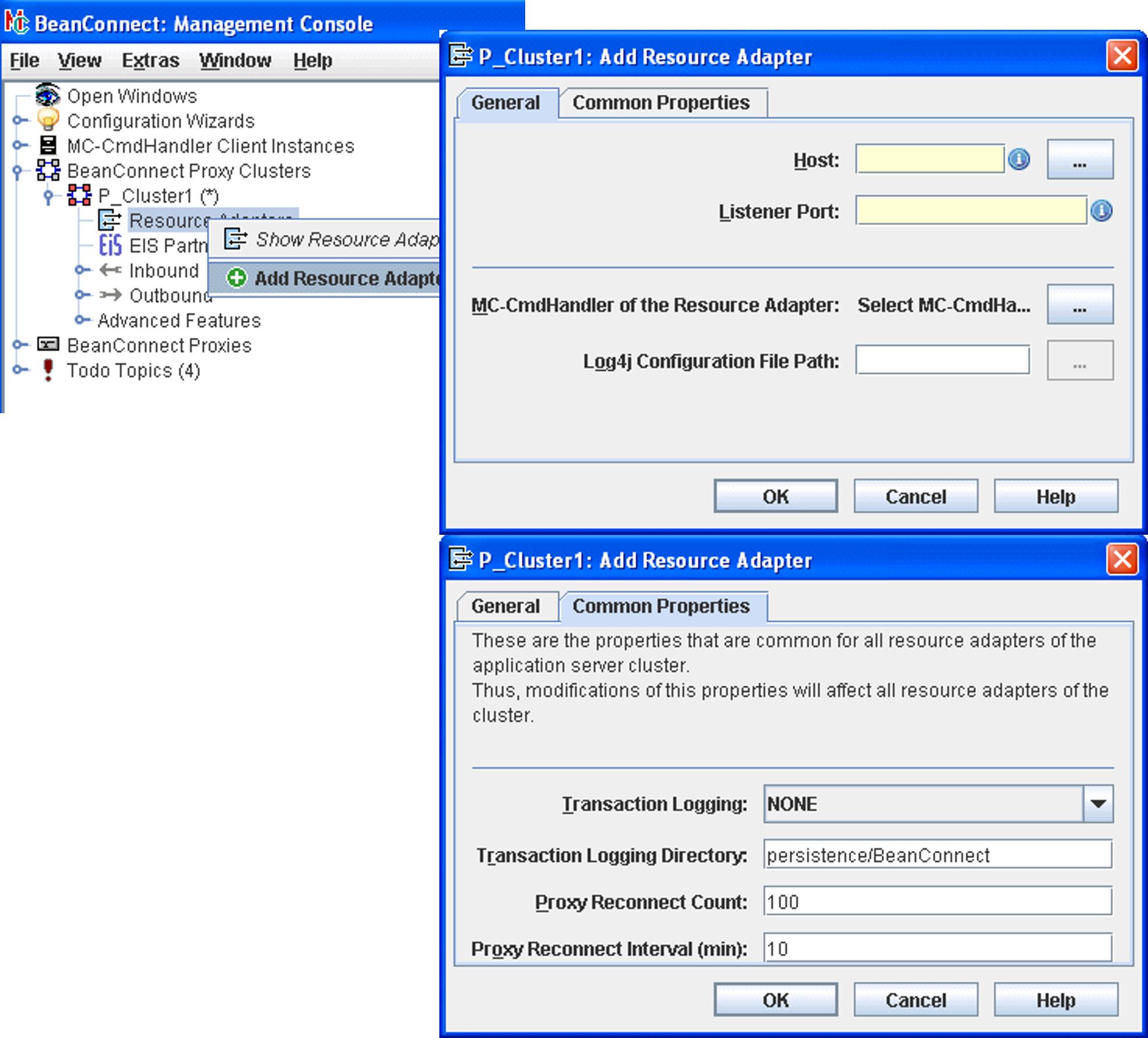 Enter the parameters for the resource adapter in the two tabs General and Common Properties. The parameters specified in Common Properties are the same for all the resource adapters in a cluster. Any change to these properties therefore affects all the resource adapters defined in the cluster, whereas the parameters specified in General are specific to each resource adapter: