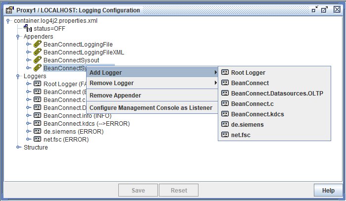 Figure 67: Configuring the appenders (example of BeanConnect proxy)