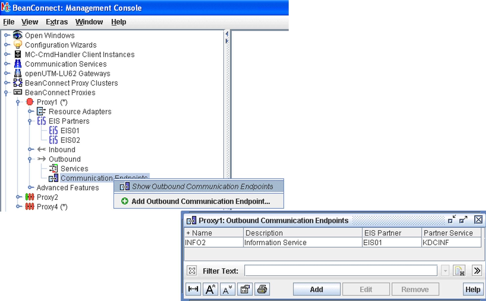 To display a list of the outbound communication endpoints of a proxy, click on the Communication Endpoints node or alternatively choose Show Outbound Communication Endpoints from the context menu of the Communication Endpoints node.