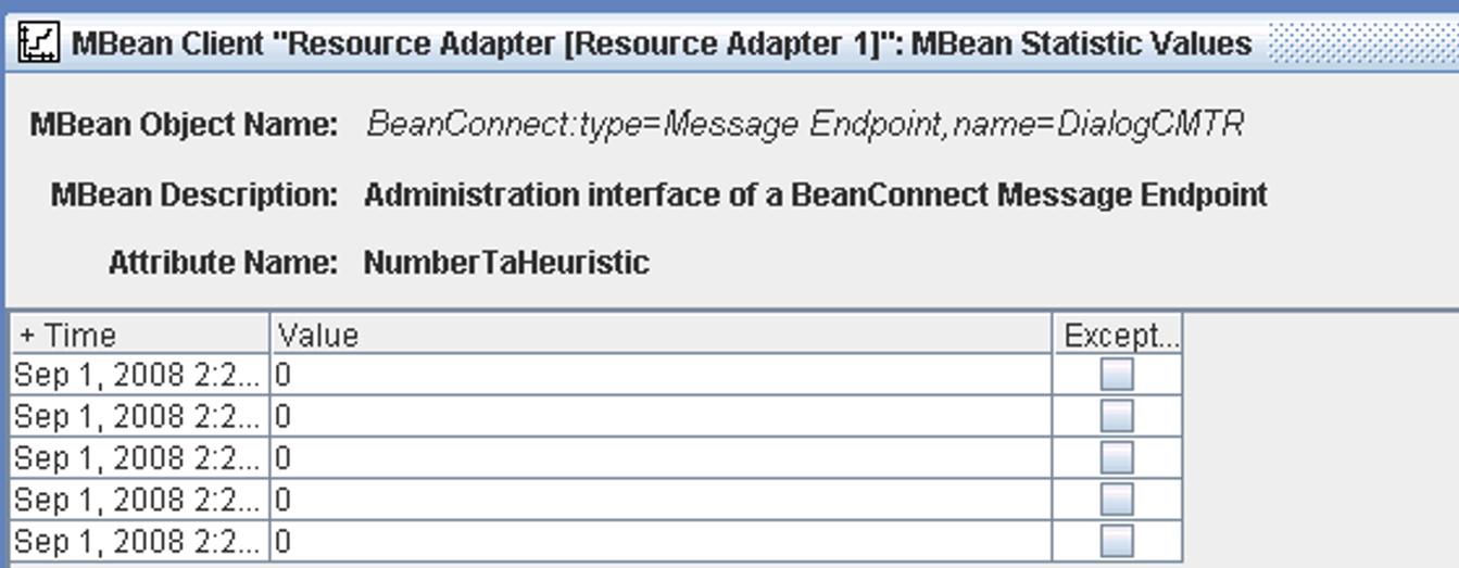 The table with the collected statistical values contains the three columns Time, Value and Exception, see the online Help system. The Exception column outputs any exception which the JMX server may have output when determining the statistical value. When you click a statistical value with the mouse, details such as the complete text of an exception are displayed in the lower part of the window.