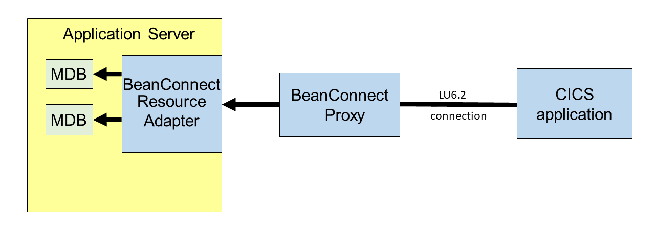 With inbound communication, an EIS sends messages to a message-driven bean application in a Java EE application server. The message-driven bean must implement a resource-adapter-specific message listener interface. BeanConnect supports the Service Endpoint Message Listener interface which forms part of the CCI (Common Client Interface) defined in the JCA specification and, additionally, its own message listener interface for dialog and asynchronous communication (see Interfaces).