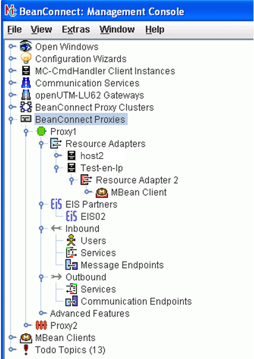 The administered BeanConnect proxies are displayed in a tree structure in the navigation area (in the same way as the drives and directories in Windows Explorer). There is a separate subtree under the BeanConnect proxies node for every BeanConnect proxy that is administered via the Management Console (Proxy1 in figure13). This subtree allows you to display and edit the configuration data of the BeanConnect proxy. If you click an item in the subtree, the configuration data associated with this component is displayed in a panel in the work area. The context menu of the entry in question also contains commands which allow you to modify the configuration data.