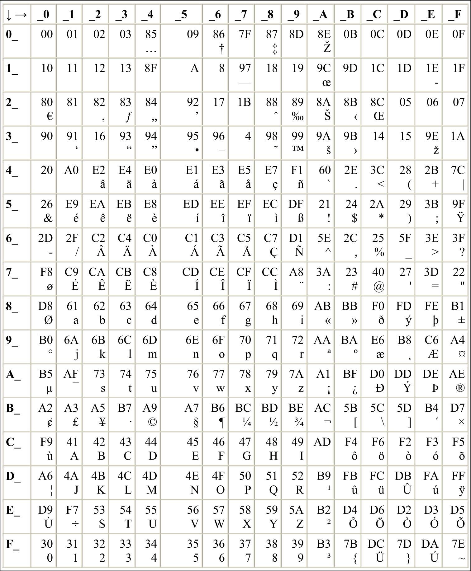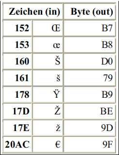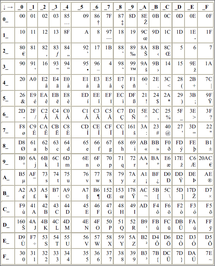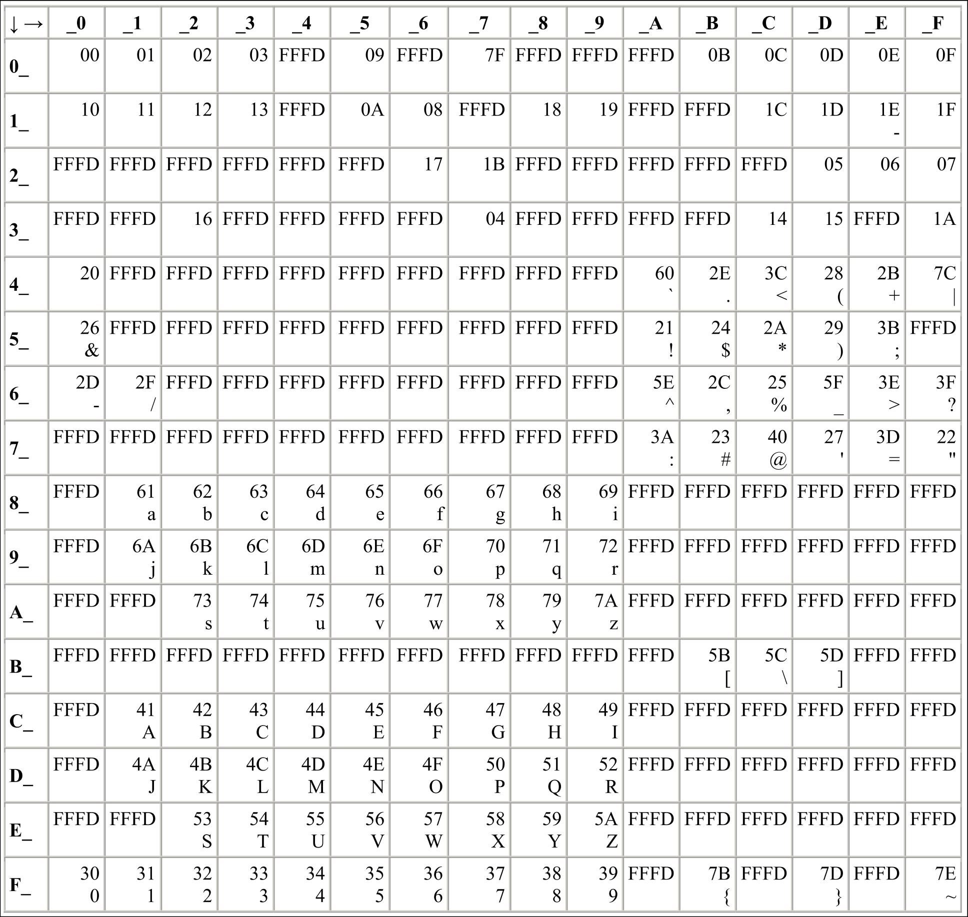 In all the following Character (Unicode) - Byte Correspondence tables
