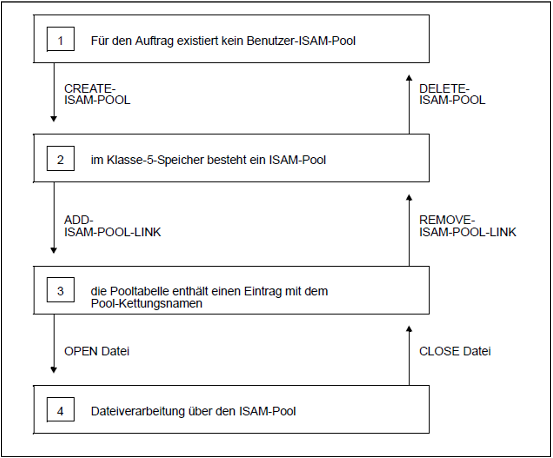 Beim Eröffnen einer Datei prüft das DVS, ob in FCB oder TFT ein Poolkettungsname eingetragen ist und ob zu diesem Poolkettungsnamen ein ISAM-Pool existiert (über die Pooltabelle). Ist dies der Fall und sind Pool- und Dateieigenschaften verträglich, wird die Datei über diesen ISAM-Pool verarbeitet.