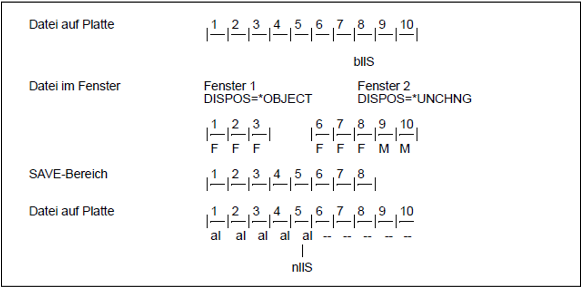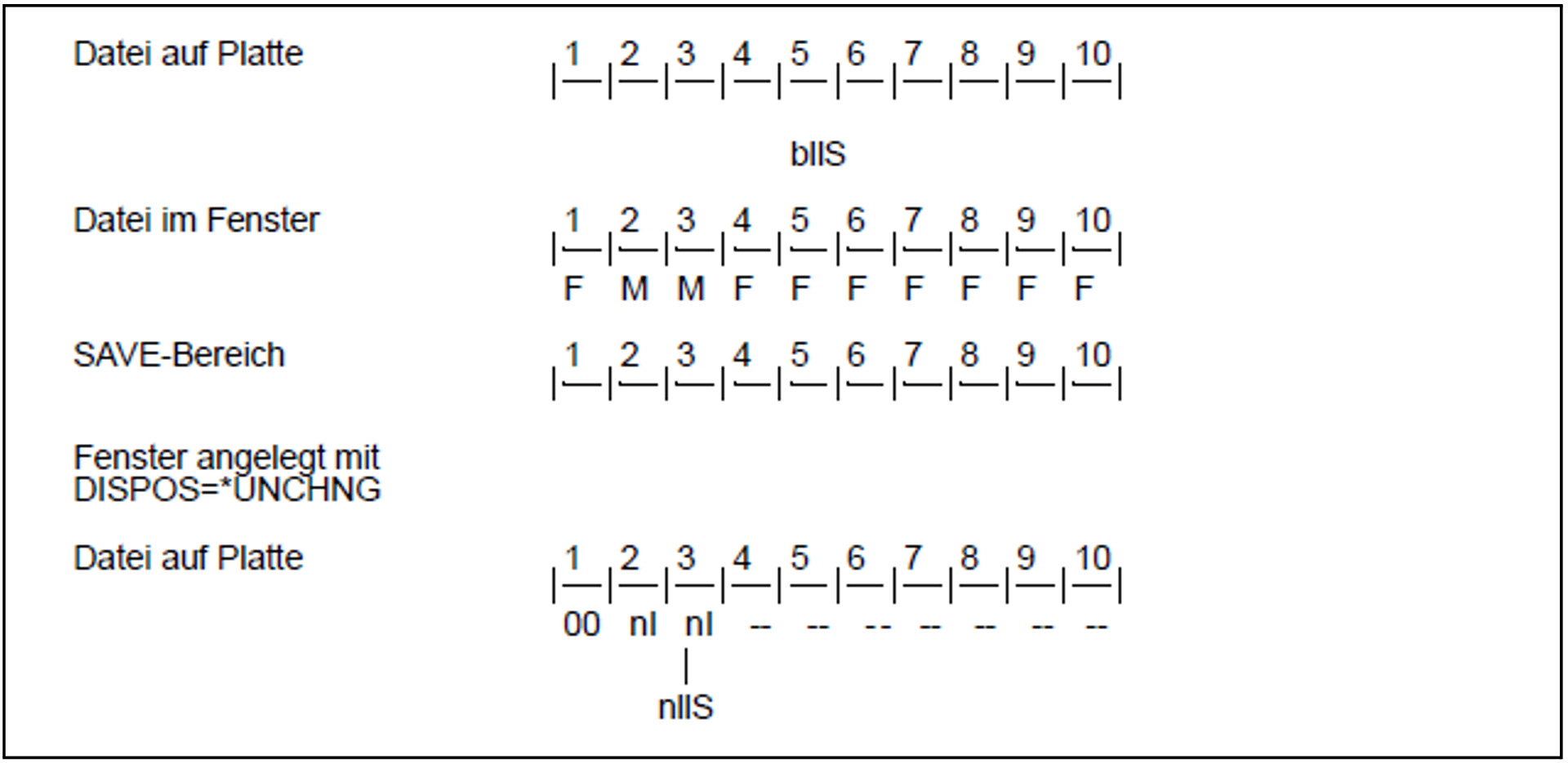 Im Beispiel wurden die Seiten 1, 2 und 3 schon einmal durch SAVE in die Datei geschrieben. Daher behalten sie ihren alten Inhalt und werden nicht mit X'00' initialisiert.