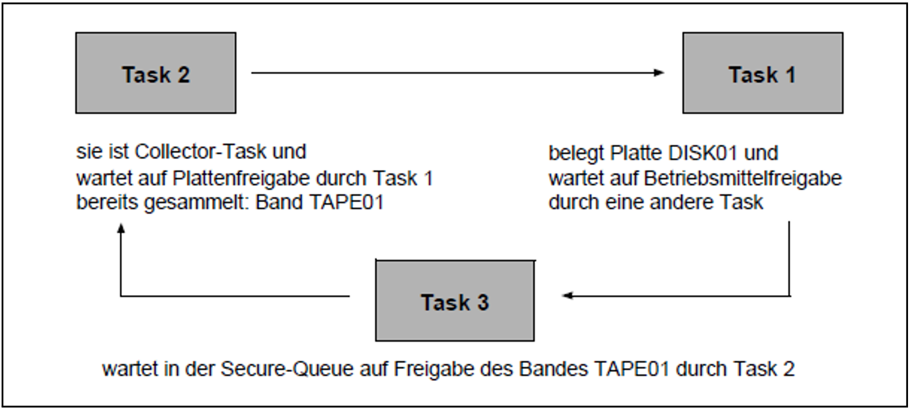 In diesem Fall würde eine Etablierung von Task 3 als Collector-Task zu einer Freigabe des Bandes TAPE01 durch Task 2 führen (Task 2 verliert seine Collector-Eigenschaft). Dadurch erhält Task 3 sein angefordertes Betriebsmittel und tritt aus der Secure-Queue aus. Nach Freigabe der Betriebsmittel durch Task 3 kann die Anforderung von Task 1 erfüllt werden; nach dessen Freigabe die von Task 2.
