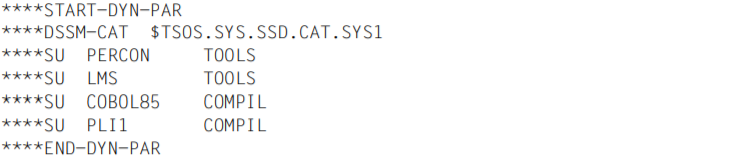 Die Änderung des Standardwerts für den Namen des DSSM-Katalogs (vordefiniert ist SYS.SSD.CAT.X) beginnt mit dem Schlüsselwort DSSM-CAT. Der neue Name wird in folgender Form vereinbart: