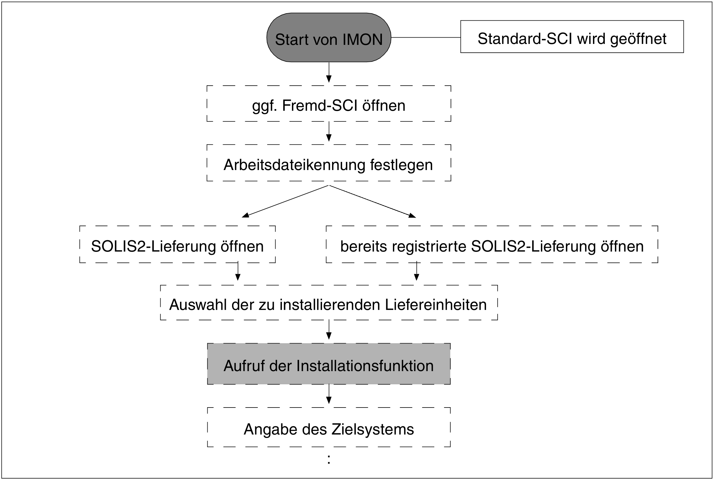 Der eigentliche Installationsvorgang wird ausgeführt, wenn die erzeugte Prozedur gestartet wird. Erst dann werden die ausgelieferten Dateien vom Liefermedium, von der Parkkennung (bzw. von der Installationskennung bei der Mehrfachinstallation eines bereits installierten Produktes) an ihren Ablageort im System gebracht. Zudem werden von IMON die vorbereitenden Maßnahmen für den Ablauf des Produkts getroffen. Die Prozedur kann sofort und automatisch von IMON oder später manuell durch den Benutzer mit dem Kommando ENTER-PROCEDURE gestartet werden. Der Name der Prozedur wird wie folgt gebildet: