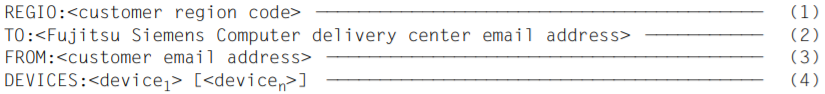 (1) | Die erste Zeile muss vorhanden sein (die nachfolgenden Zeilen sind optional). Hinter „REGIO:“ steht der Regionalcode (Zeichenkette aus 3 Buchstaben) des für den Kunden zuständigen regionalen Auslieferungszentrums von Fujitsu Technology Solutions. Diese Angabe benötigt IMON zum Generieren der formatierten Anforderung mit dem Dateinamen $TSOS.IMON.DELREQ.<timestamp>. |