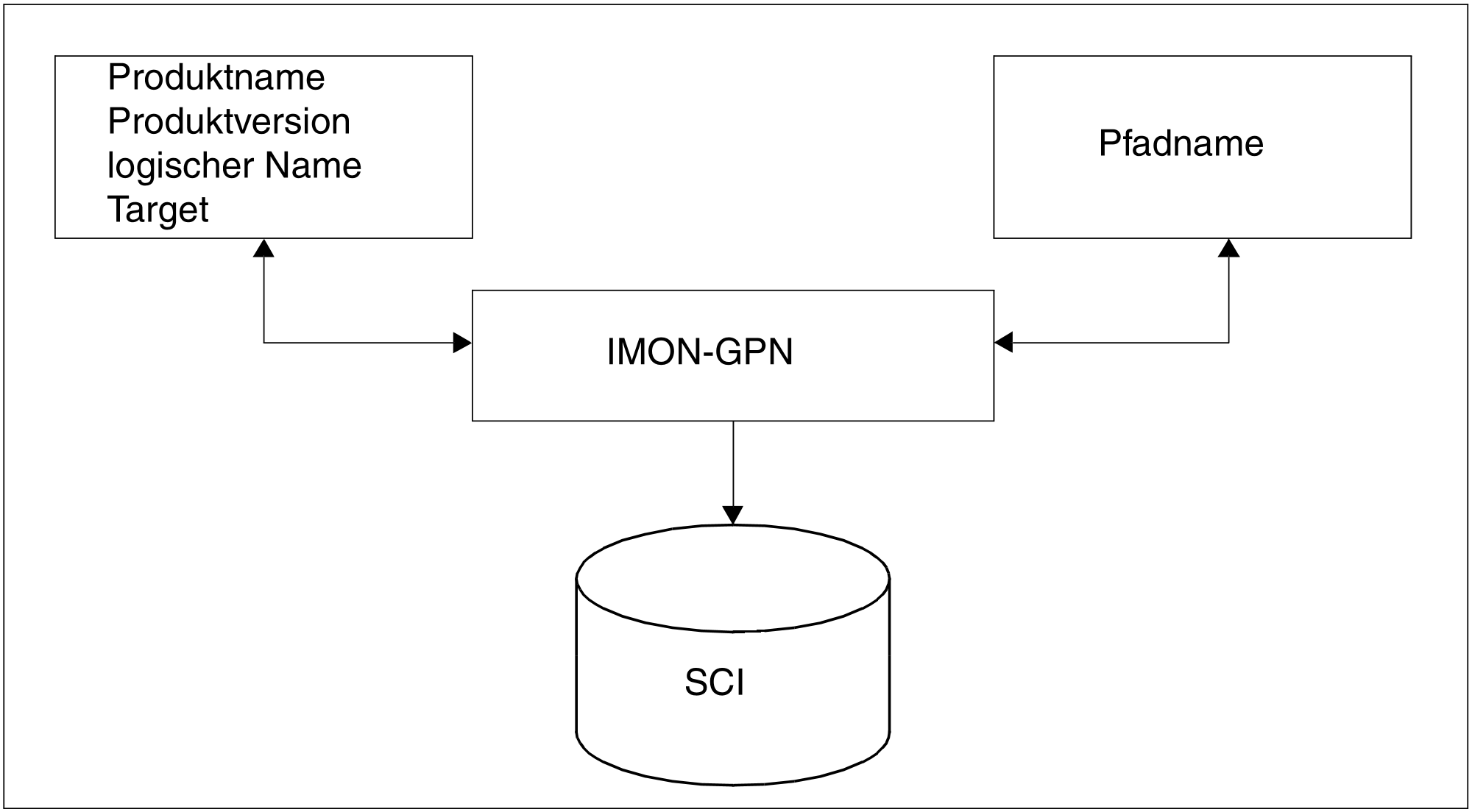 Ein im BS2000 installiertes Produkt besteht aus mehreren Installation-Items (Dateien), die unter einer oder mehreren Benutzerkennungen abgelegt sind. Ein Installation-Item wird im Produkt durch seinen logischen Namen (logical ID) und den Pfadnamen der dazugehörigen Datei eindeutig bestimmt. Hardware-abhängige Installation-Items besitzen einen logischen Namen und eventuell mehrere Pfadnamen mit unterschiedlichen Kennzeichen für die Hardware-Abhängigkeit (TARGET, siehe auch "Pfadname, logischer Name und Typ eines Installation-Items "). IMON-GPN unterstützt Sie bei der Zuordnung von logischen Namen zu Pfadnamen von Dateien. Diese Zuordnung speichert IMON- GPN im SCI. Der logische Name und der Pfadname wird während der Installation erstmals in das SCI eingetragen.