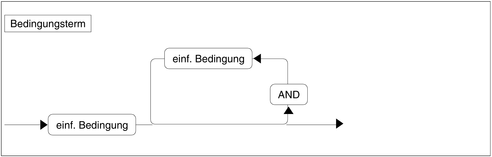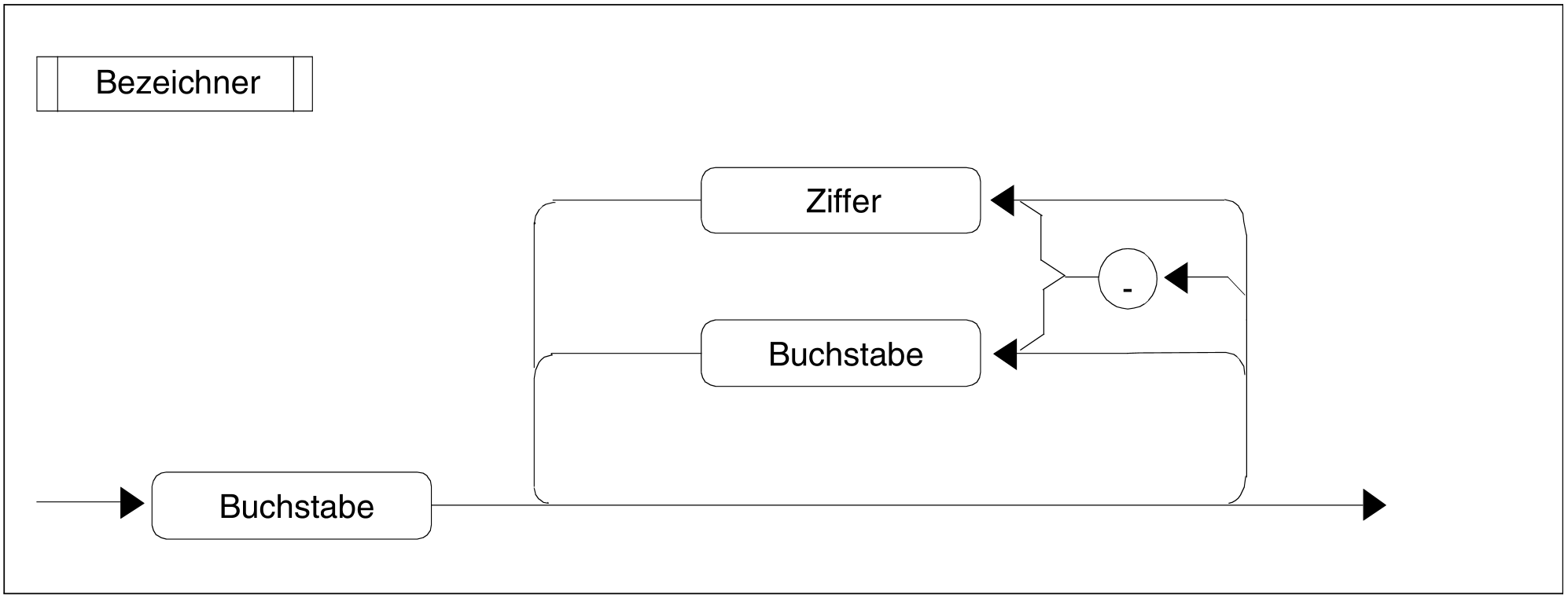 Um eine zu umfangreiche Darstellung der Diagramme zu vermeiden, gilt Folgendes: Verbindungslinien zwischen den Kartuschen repräsentieren ein Trennzeichen (siehe "Lexikalische Elemente"). Nur vor und nach einem Sonderzeichen darf das Trennzeichen weggelassen werden. In Diagrammen, deren Kopf mit Doppel-Linien umrahmt ist, dürfen keine Trennzeichen gesetzt werden.