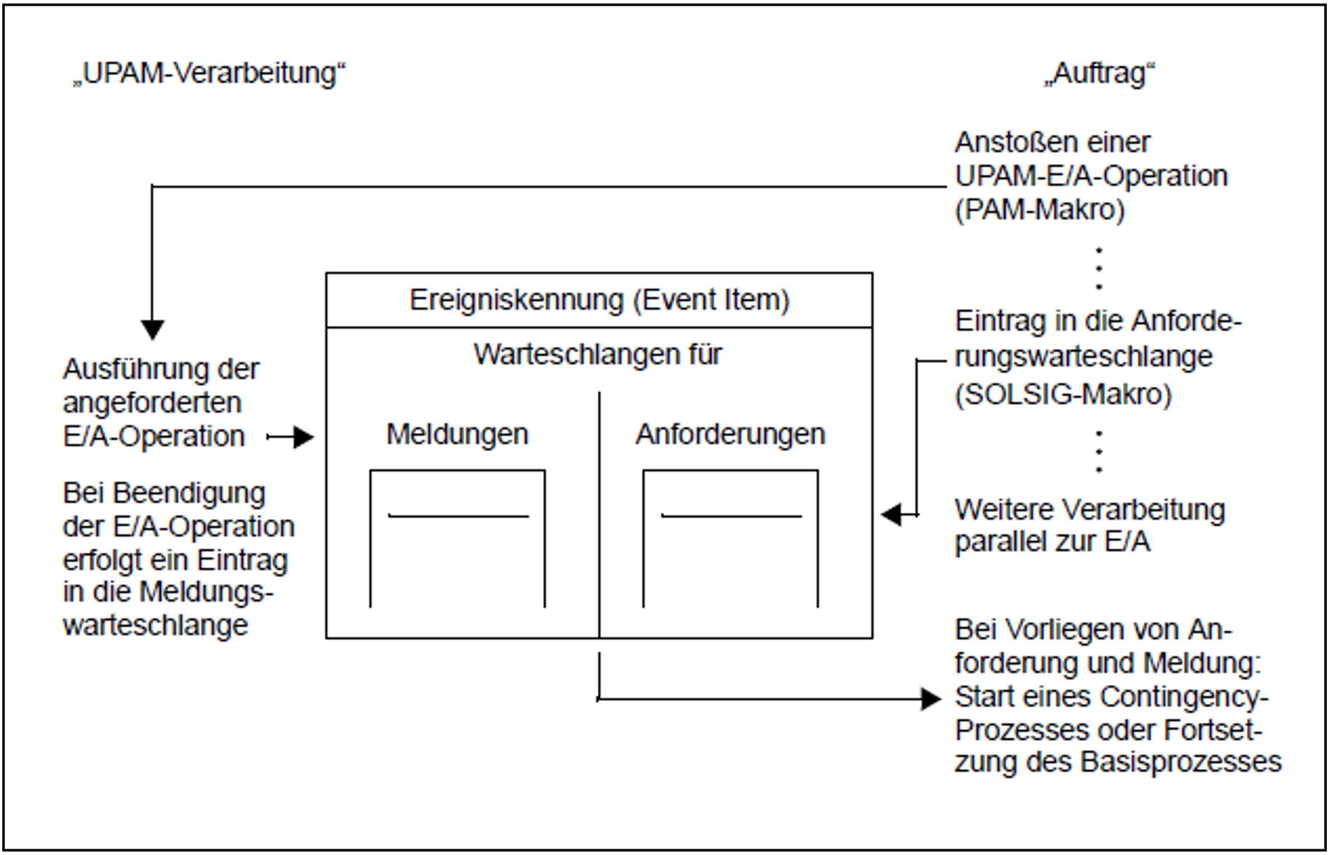 UPAM gibt nach Vollendung einer Ein-/Ausgabe-Operation eine Meldung an die zugeordnete Ereigniskennung (mit dem Makroaufruf POSSIG). Diese Meldung trifft dann sofort oder später auf die vom Benutzer ausgegebene Anforderung (SOLSIG-Makroaufruf). Liegen sowohl Anforderung als auch Meldung vor (für dieselbe Ereigniskennung), wird ein Contingency-Prozess gestartet oder der Basisprozess fortgesetzt.