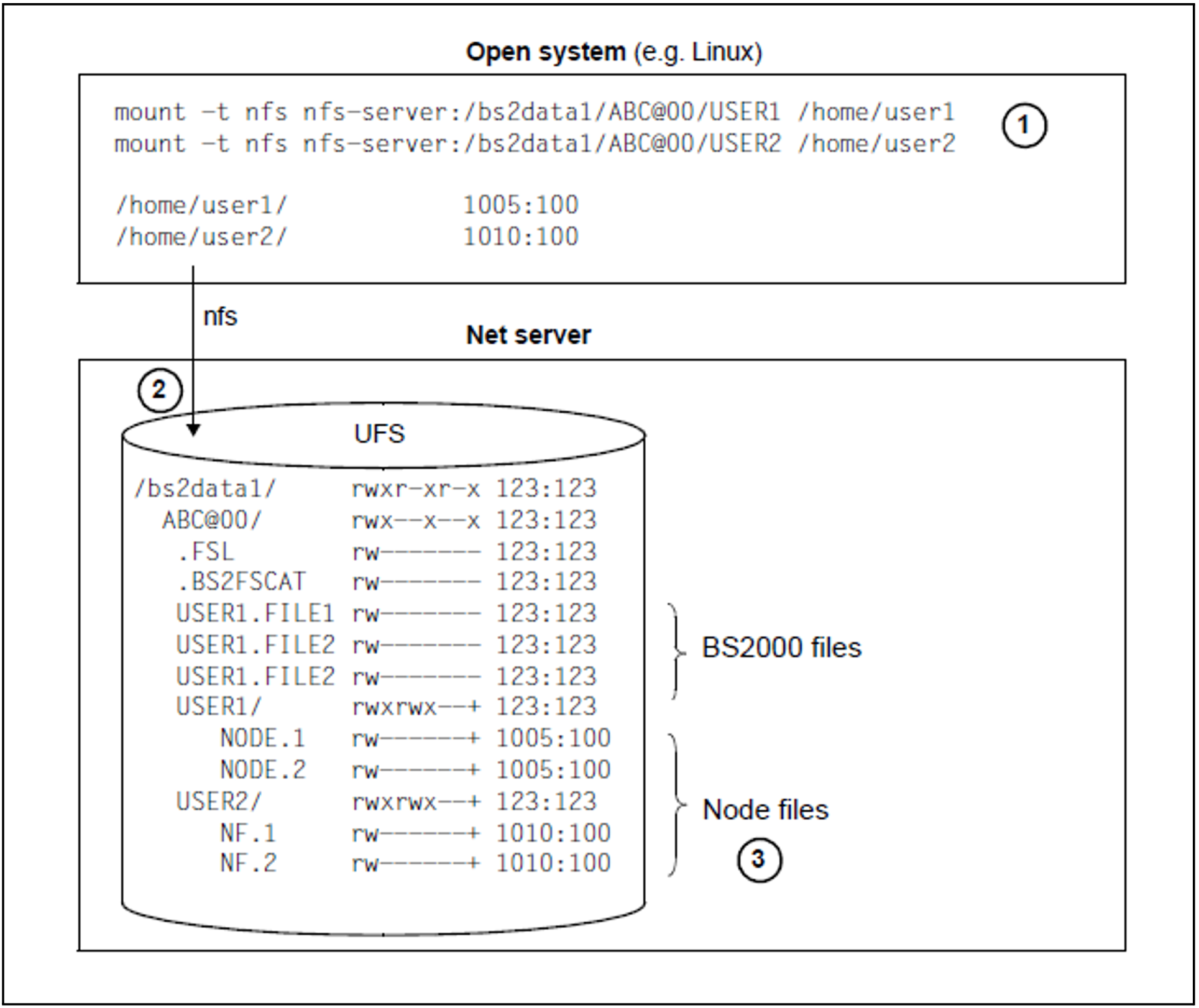 1. Open systems obtain access to BS2000 files and node files on the net server by means of mount commands.