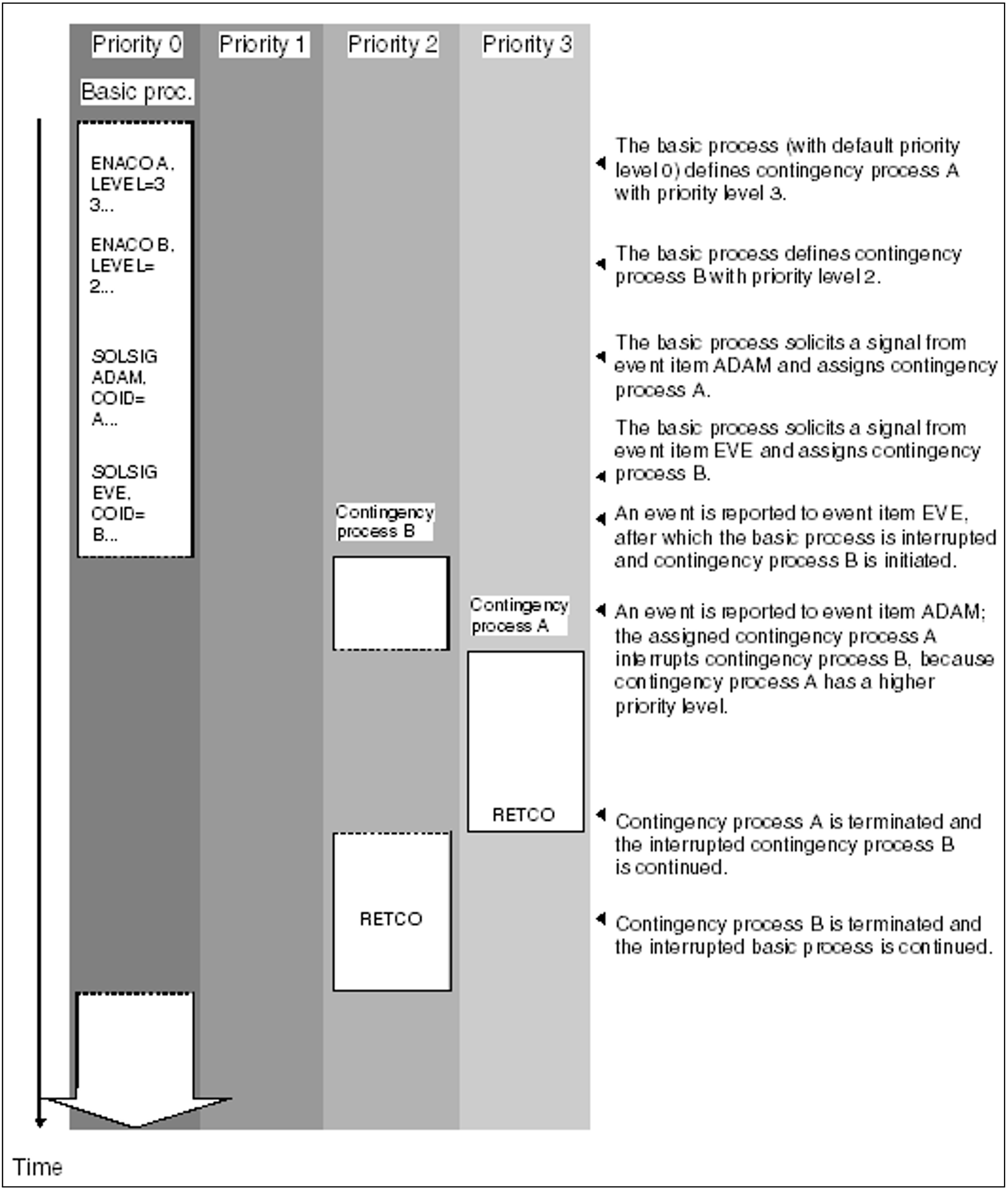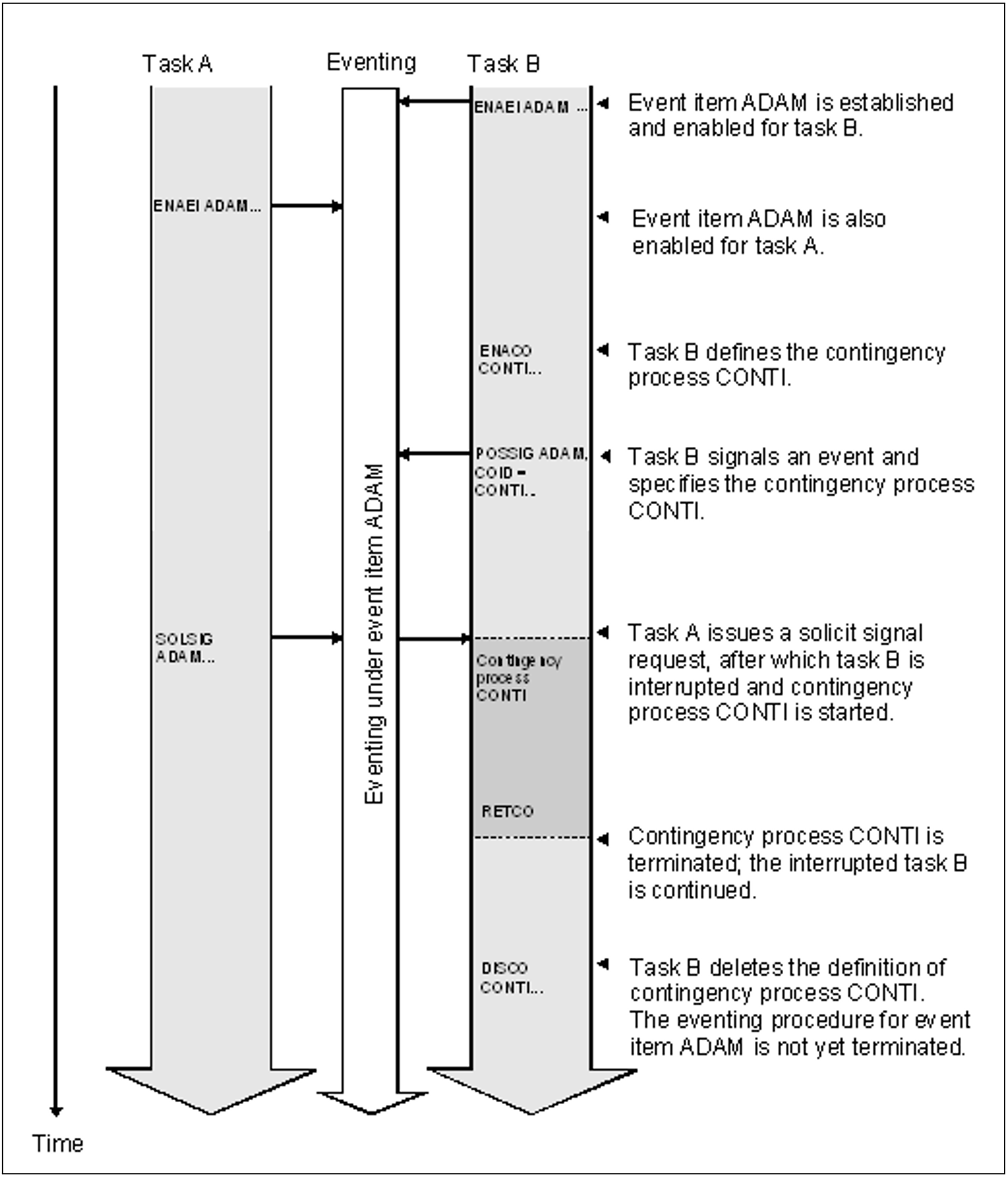 (4) | Contingency processes CONTA and CONTE both have priority 1. The system starts with the contingency process whose corresponding event item is the first to receive a SOLSIG and a POSSIG call. In this case, a SOLSIG call already exists for each event item, and a POSSIG call arrives earlier for the EVE event item than for ADAM. Therefore, contingency process CONTE is started first, followed by contingency process CONTA. |