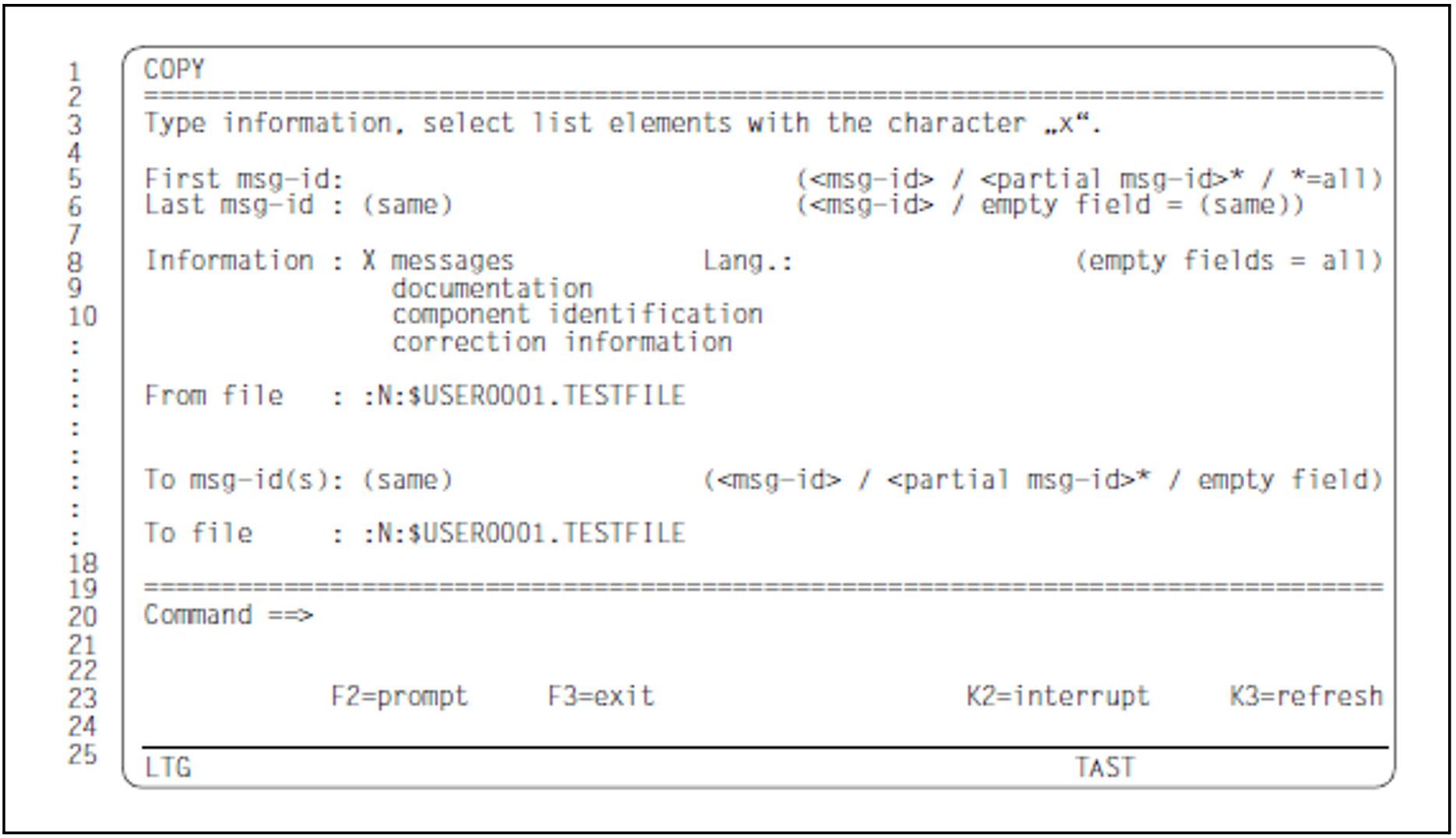 It is possible to call the COPY mask directly from MENU without entering a file name in the main mask. If a message file name is entered in MENU, this name is transferred to the From file and To filefields of the COPY mask.