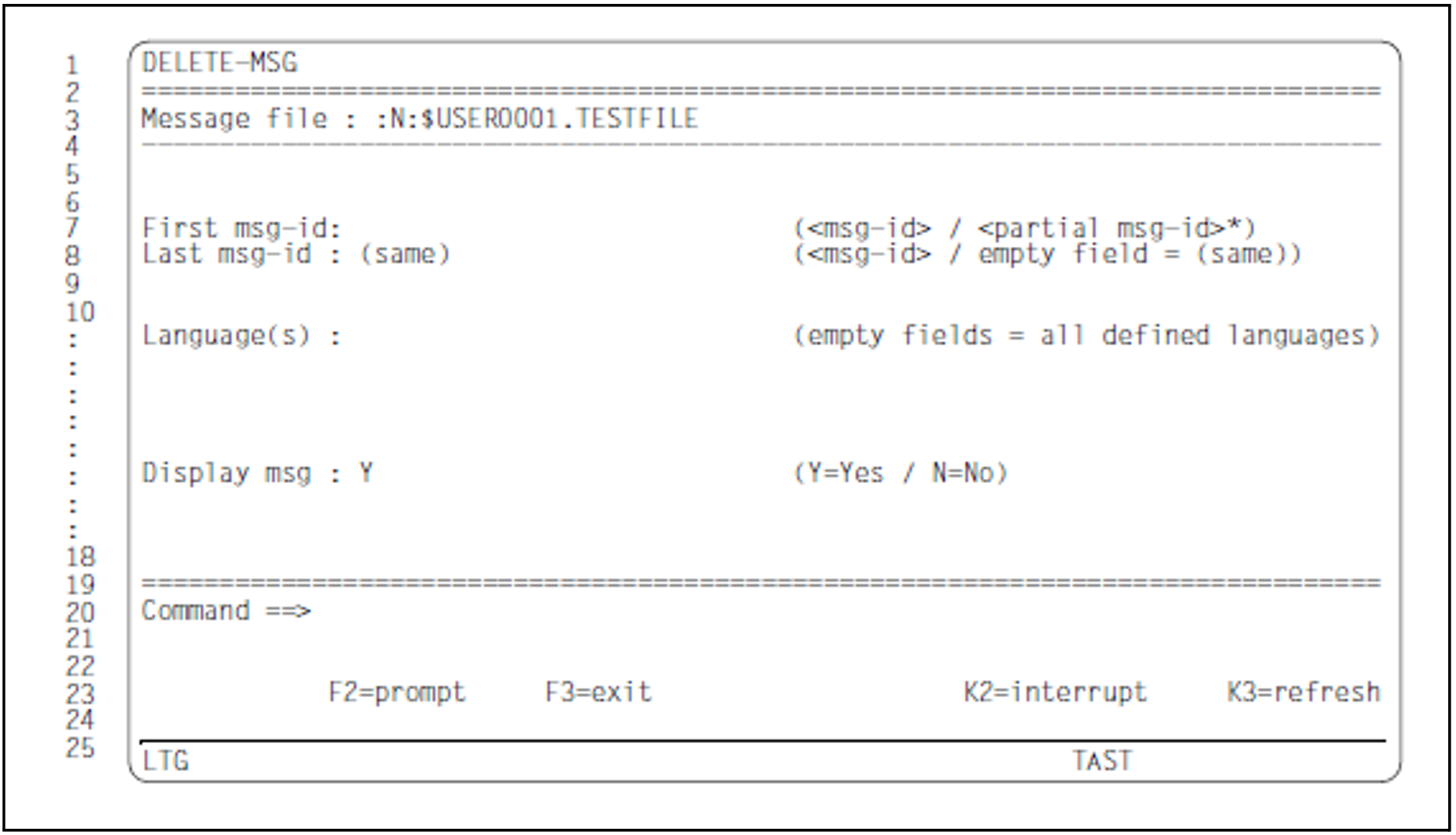 The current message file is displayed. It was opened in the MENU mask. The file name cannot be modified in the DELETE-MSG mask.