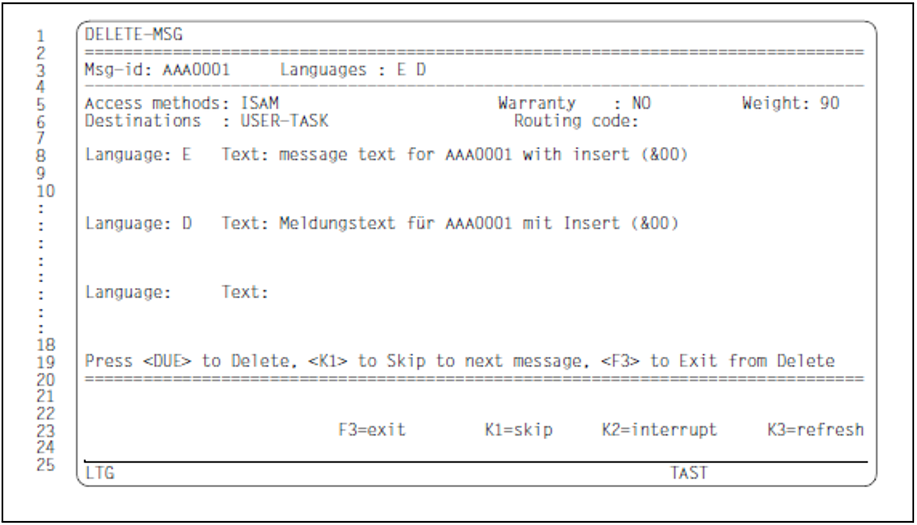 This mask is called if “Meldung anzeigen: Y” was specified in the first DELETE-MSG mask.The message code and the letters identifying the selected languages are displayed in the information area of the mask.