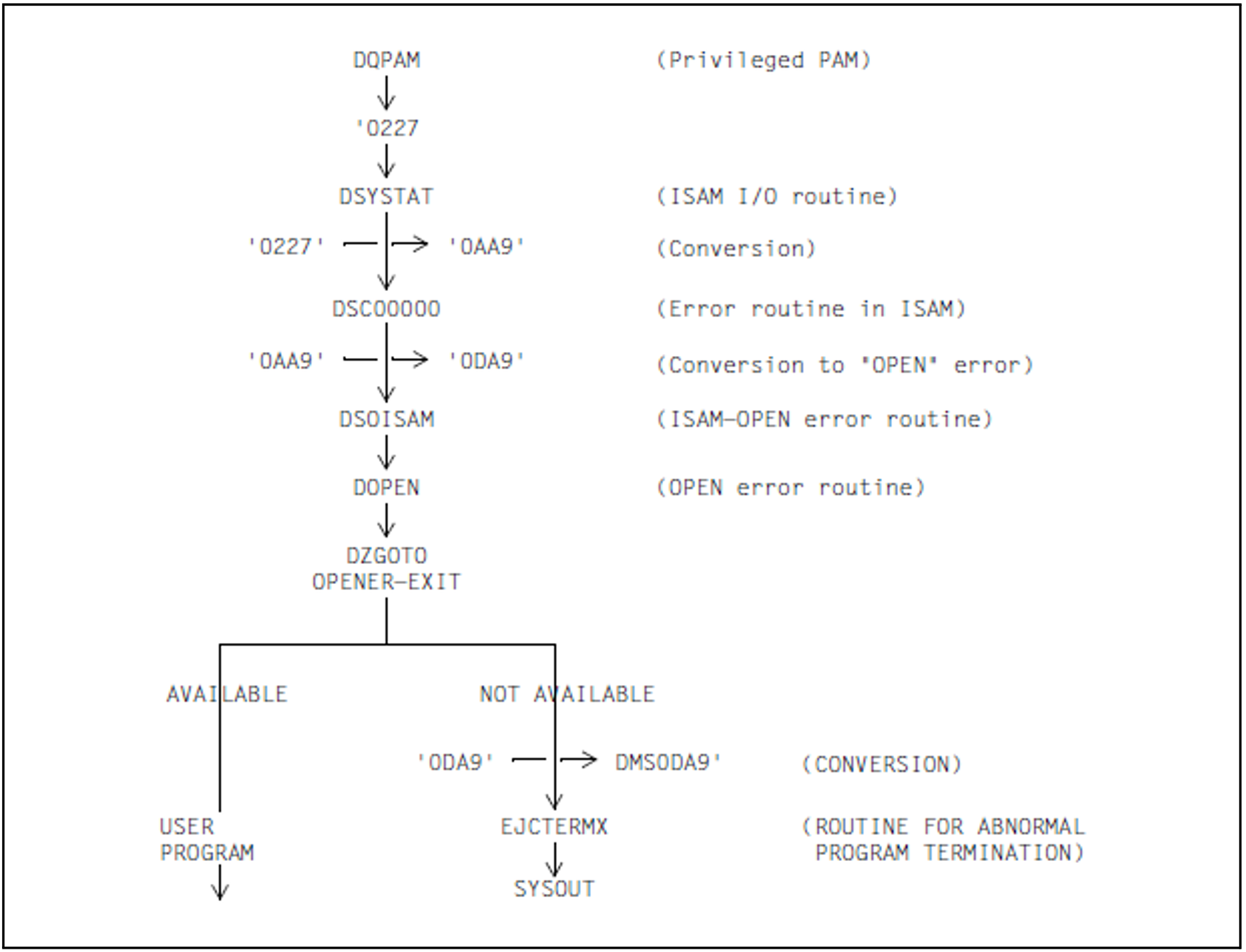 two-stage (error in the called component): a user calls UPAM, which in turn calls PPAM. PPAM detects an I/O error: in this case, PPAM passes error code 0227 to UPAM in register 15. UPAM modifies this error code to 0927, places it in the FCB, and branches via $GOTO to ERRADR.