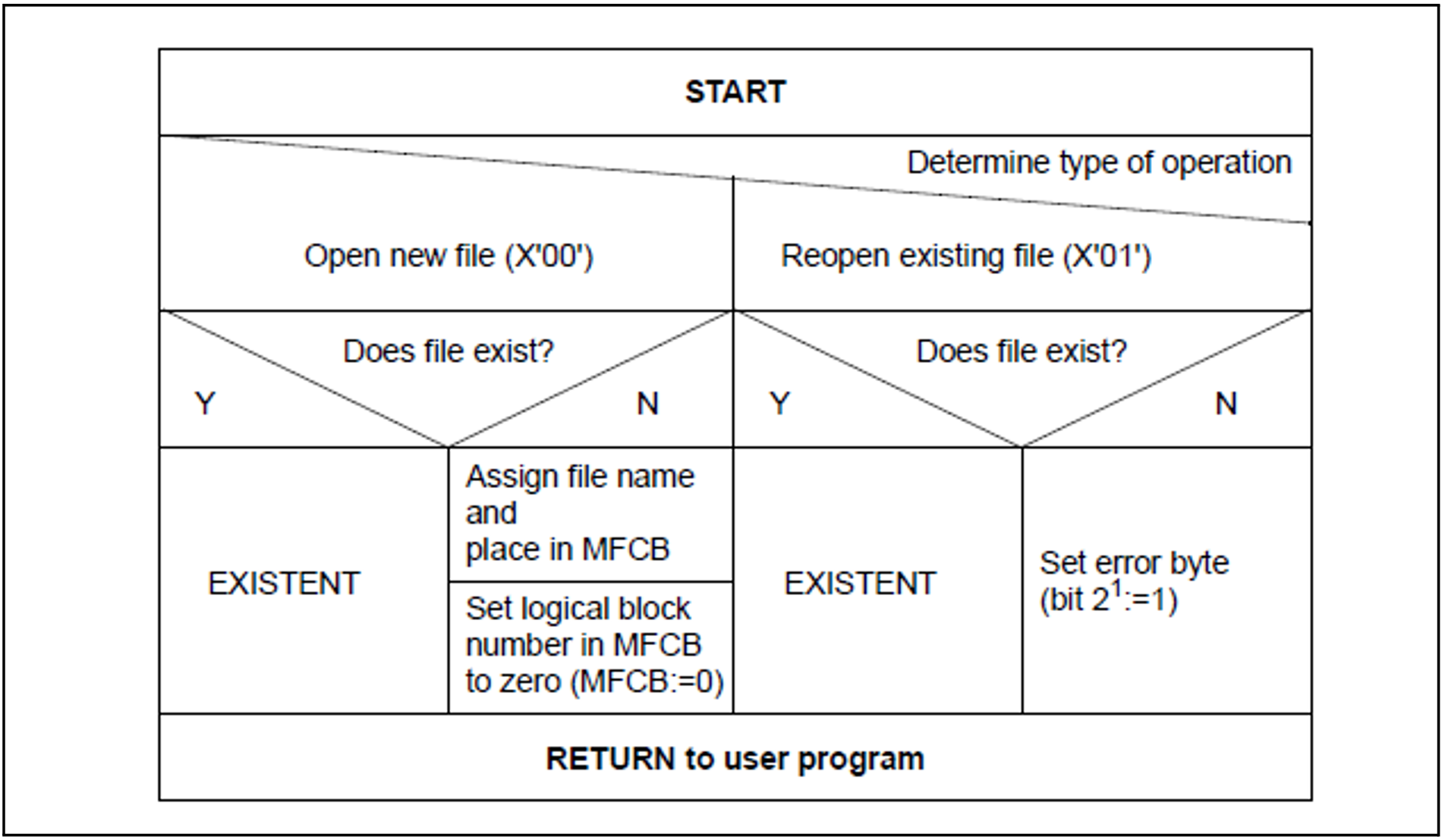 Each job can process exactly one object module file. If bit IDMFOO of the option byte is set, all operations relate to the object module file. The actions involved in opening or reopening a file are illustrated in the following diagram: