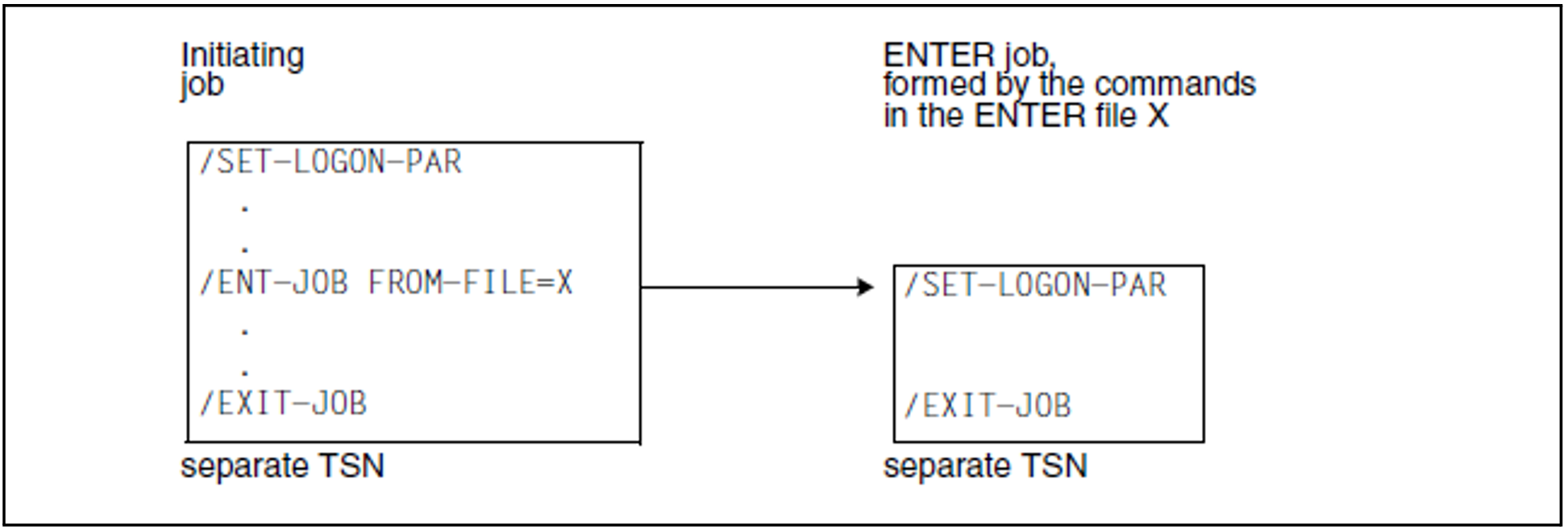 The ENTER-JOB command enables another batch job (ENTER job) to be initiated from an interactive or batch job. This new batch job is independent of the issuing job and is assigned its own task sequence number (TSN) by the system. The batch job is also called an ENTER job (see figure "ENTER-JOB starts ENTER job" in section "ENTER-JOB"). The former term ENTER procedure, on the other hand, is regarded as obsolete because it is too reminiscent of the ENTER-PROCEDURE command. However, this command expects a different file format.