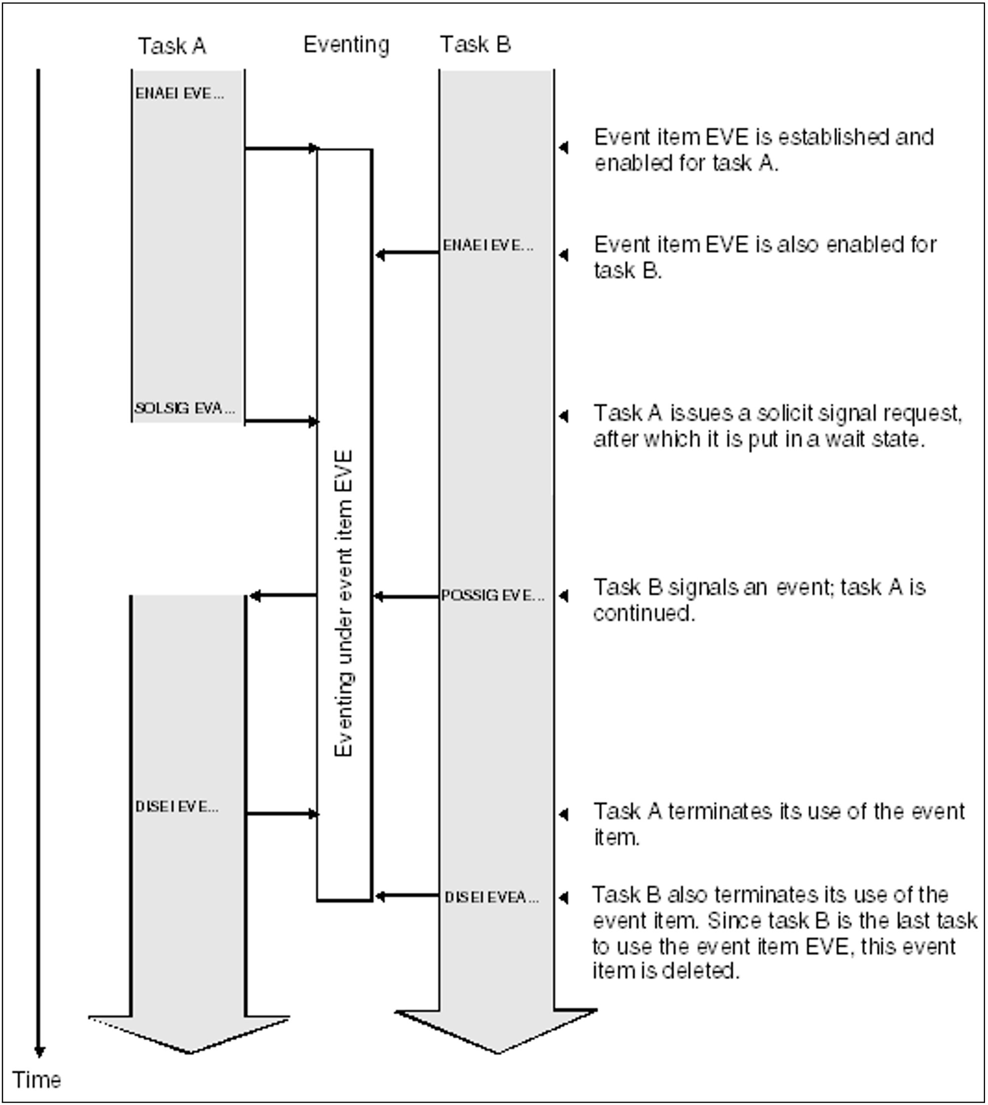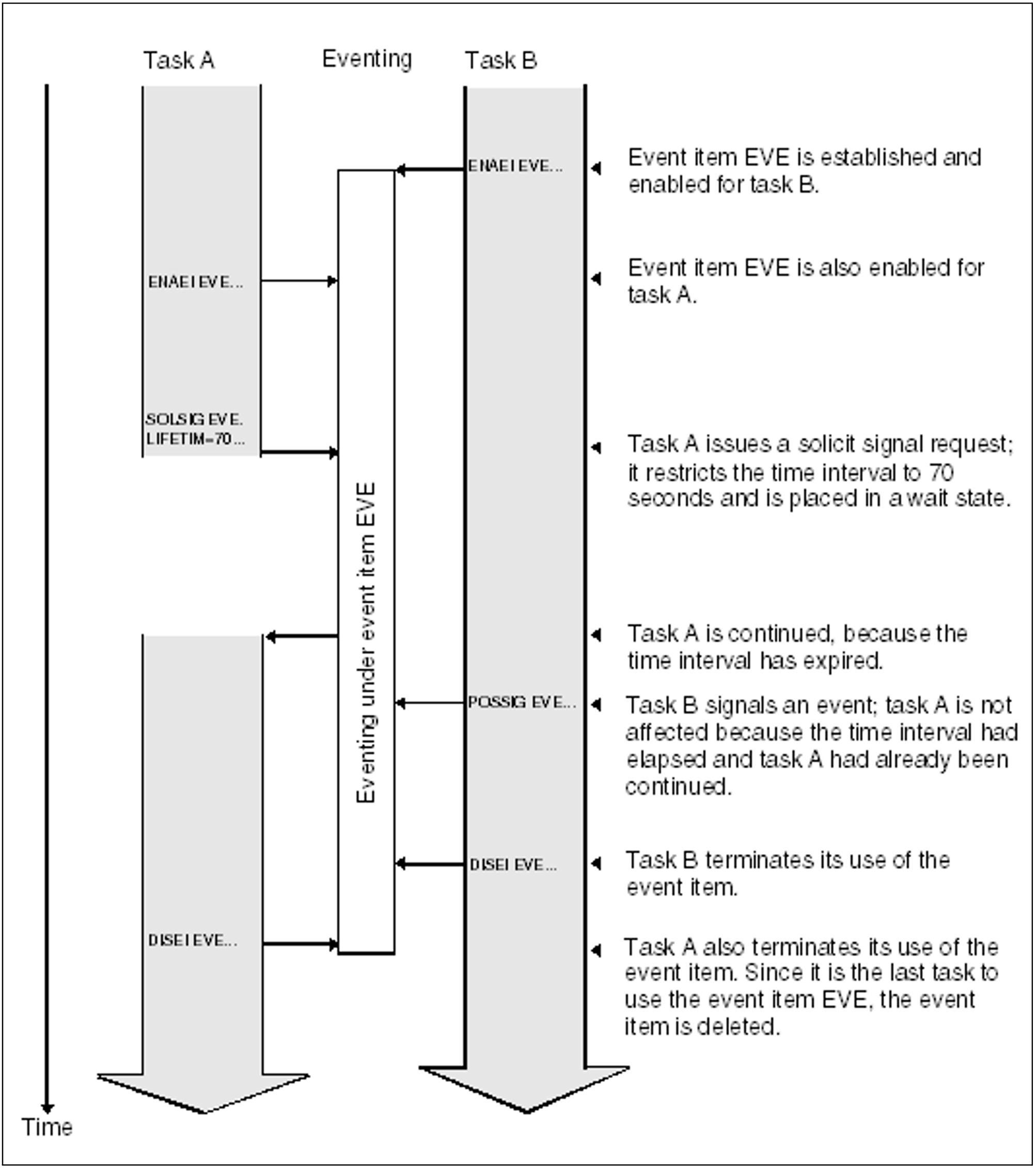 Enabling participation in eventingPrograms whose execution is to be coordinated must open (enable) their participation in eventing and specify the name (and scope) of a common variable (event item). The declarations concerning participation, and the specification of the event item, apply only to the program currently being executed.For each event item, two queues are set up (POSSIG and SOLSIG queues). A task may use up to 2000 event items simultaneously.