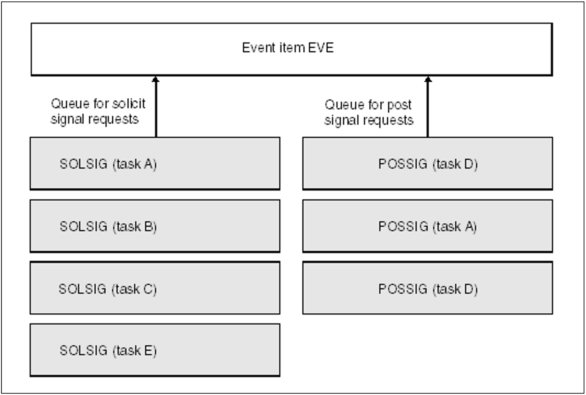 Sending a signalA program wishing to report the completion of a particular processing operation sends a POSSIG signal to eventing. This signal is entered in the POSSIG queue (on the FIFO principle).