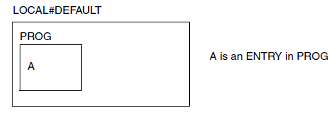 A program stored as an element with the name PROG in a program library is called. DBL generates the default link concept LOCAL#DEFAULT for resolution of external references.