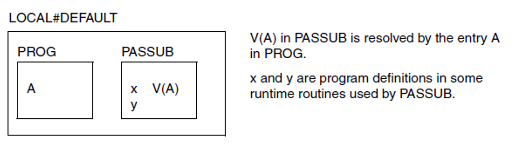 Subsequently, PROG calls the subroutine CSUB, which is written in a different programming language (in C) than that used for PASSUB but also uses runtime routines called x and y. In order to avoid name conflicts, the BIND macro must be called as follows: