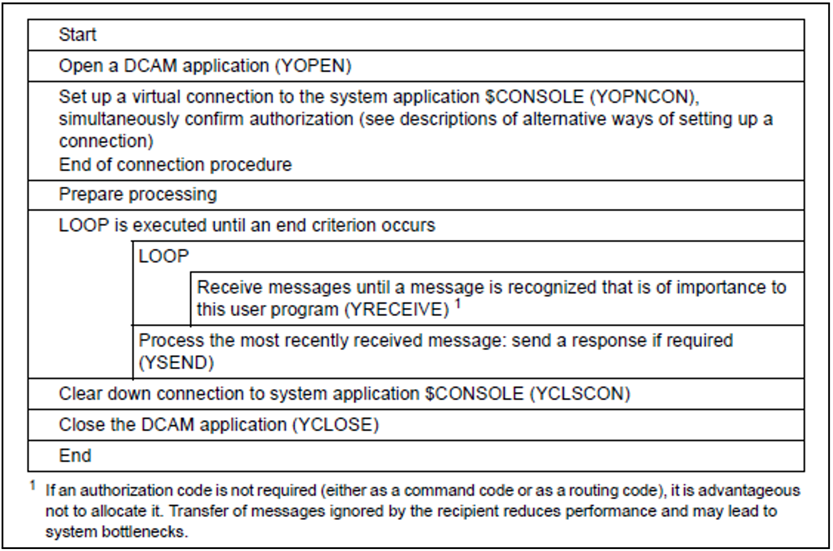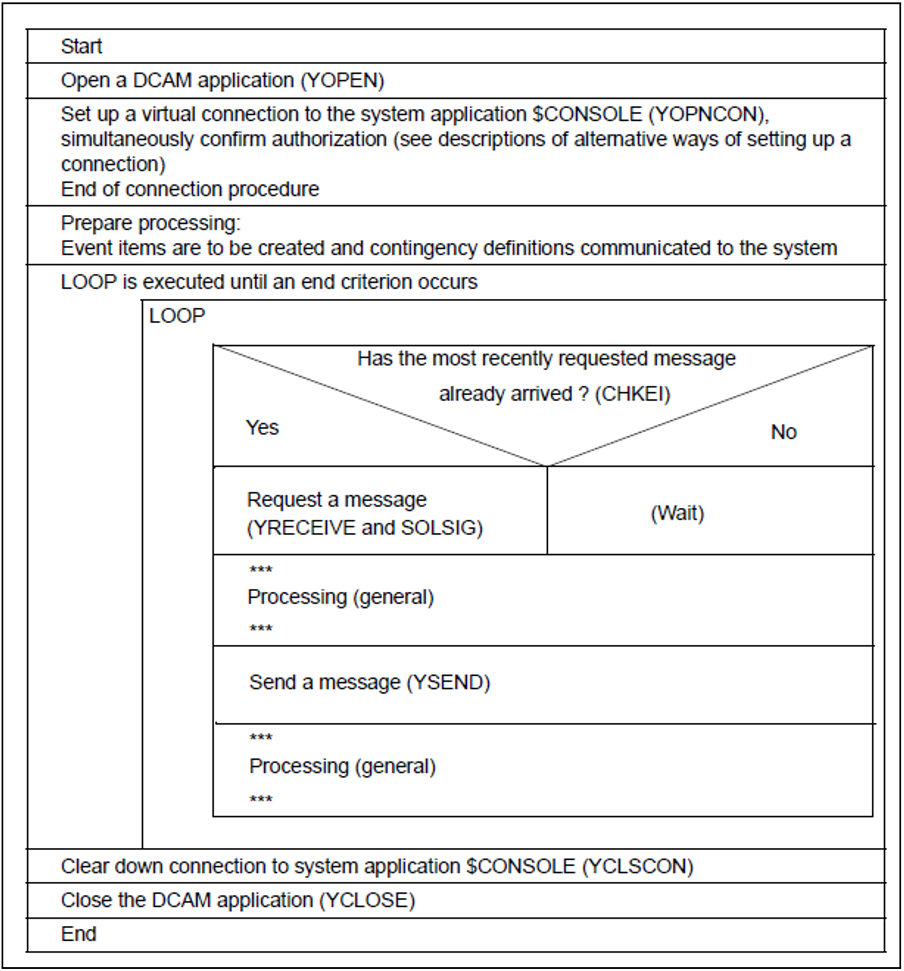 If, however, asynchronous processing of incoming messages is required, the programmer has to use Assembler (with macro calls for event-driven processing). For details refer to the manuals “DCAM Program Interfaces” [13], “DCAM COBOL Calls” [11], “DCAM Macros” [12] and “Executive Macros” [30].