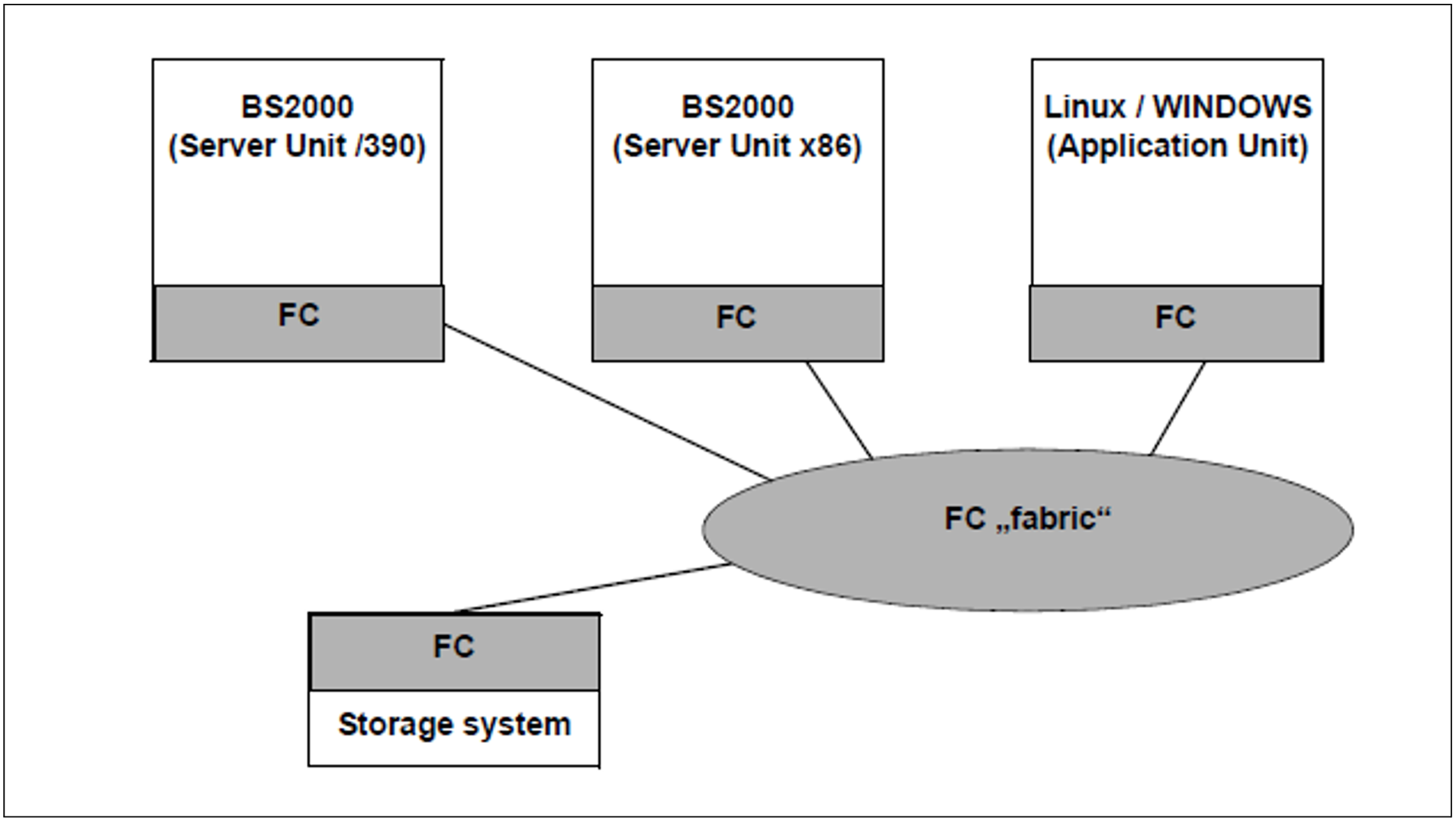 BS2000 supports connections of the type “fabric” for the storage systems attached with the Fibre Channel Protocol. Here dedicated connections are set up between Server Units and storage systems. A Server Unit sees only the storage systems assigned to it. The Server Units and storage systems form domains which are assigned to each other via switches (called “zoning”).