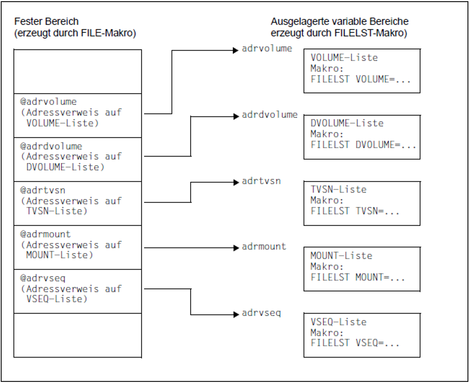 Depending on the access method, data structures such as the record length, block size, etc. can be defined by means of the FILE macro.