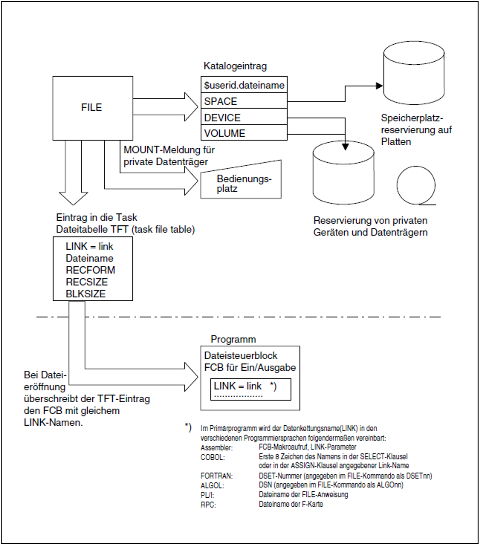 Via the task file table (TFT), the FILE macro establishes a connection between the program and the file and between the file attributes defined in the FILE macro or the catalog entry and the FCB macro.