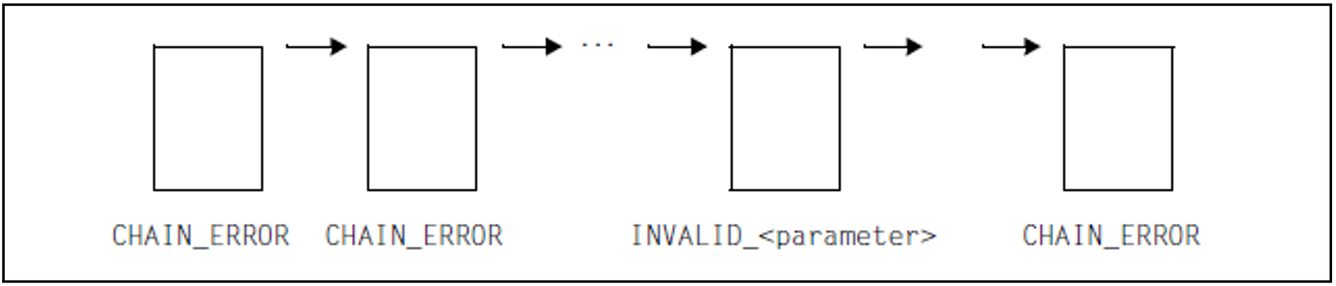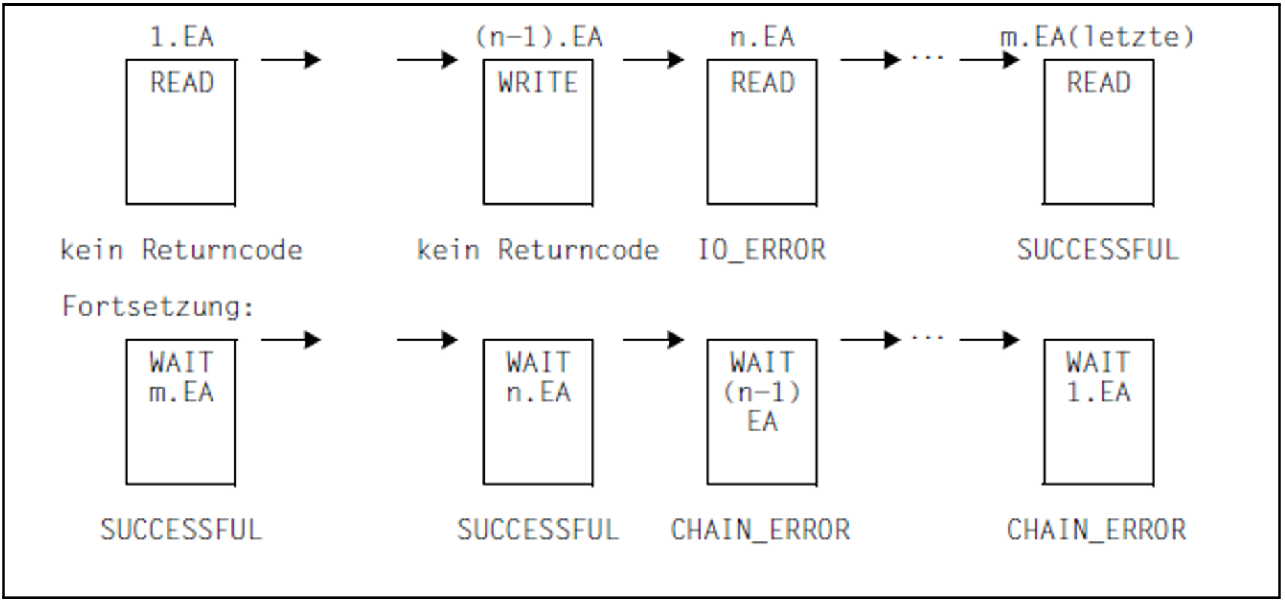 The jobs are executed in the order of their concatenation. If a parameter error is encountered in one of the jobs, all other jobs will be rejected with a “CHAIN ERROR” return code. For all other errors, no further job will be processed as of the point at which the error is detected (except for return code FACCPNAC), and all jobs which follow will also be rejected. If asynchronous I/O operations with concatenated “wait parameter lists” are involved, wait operations that have been rejected due to an error must therefore be repeated by the user.
