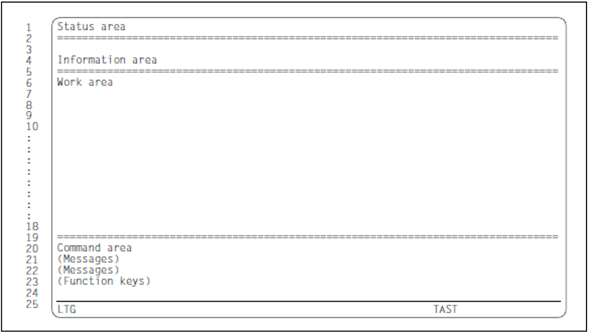 This area is used to display error messages, warnings and information which can overwrite the bottom one or two lines of the command area. The final part of a long statement may be lost.
