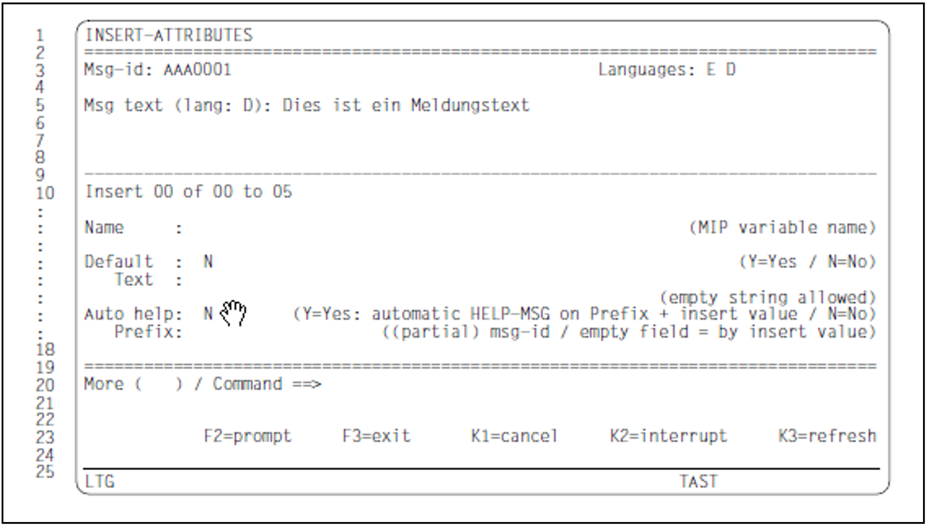 The user calls the INSERT-ATTRIBUTES mask by selecting the field „Edit: X insert attributes” in the ADD-MSG or MODIFY-MSG mask. The INSERT-ATTRIBUTES mask allows the user to add, modify or delete names and default texts for the inserts defined in the message texts. The modifications are confirmed by hitting DUE. The inserts defined in the message unit are common to all the defined languages.