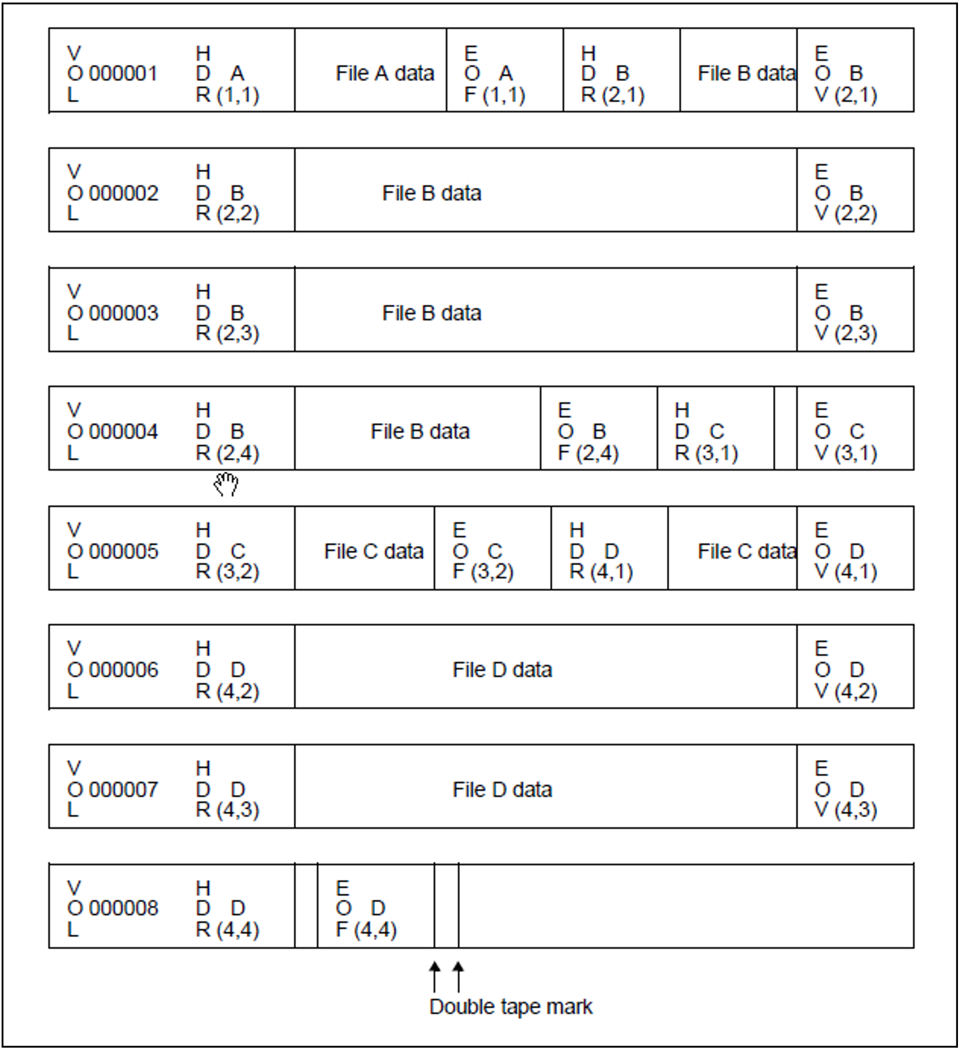 The file set consists of files (A,B,C,D). The associated volume set contains the tapes: (000001, 000002, 000003, 000004, 000005, 000006, 000007, 000008).
