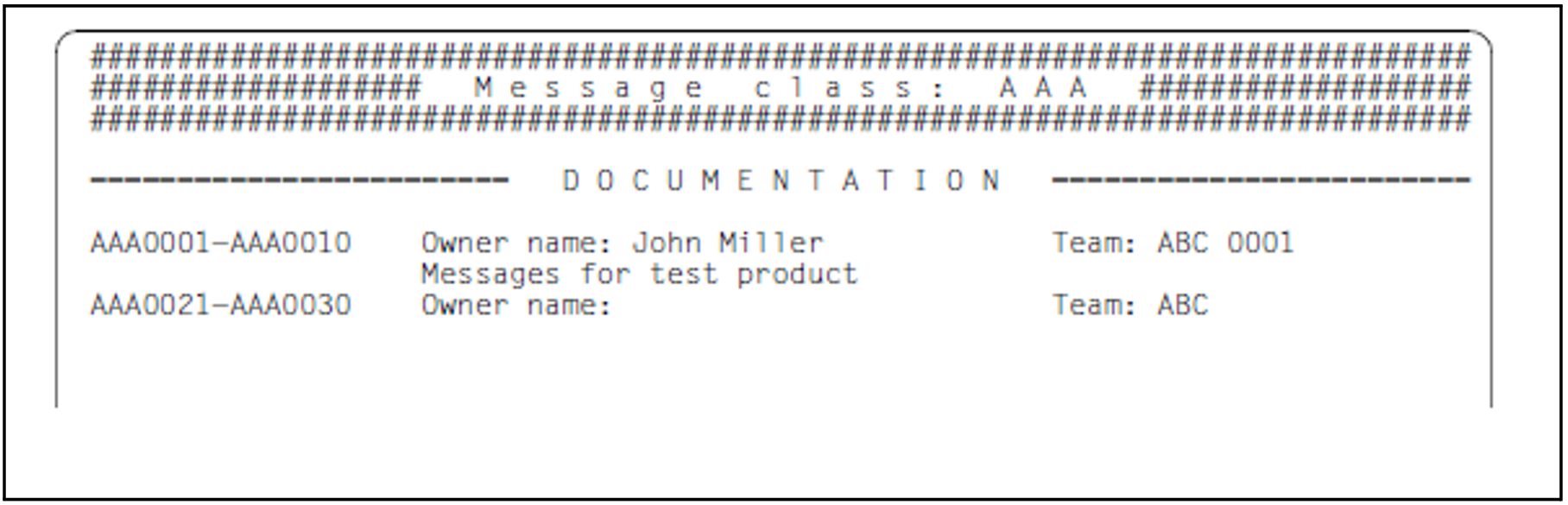 //ADD-DOCUMENTATION - MSG-ID=*INTERVAL(FROM=AAA0001,TO=AAA0010),- OWNER=*PARAMETERS(NAME='John Miller',TEAM='ABC 0001'),- COMMENTS='messages for test product' //ADD-DOCUMENTATION - MSG-ID=*INTERVAL(FROM=AAA0021,TO=AAA0030),- OWNER=*PARAMETERS(TEAM='ABC')