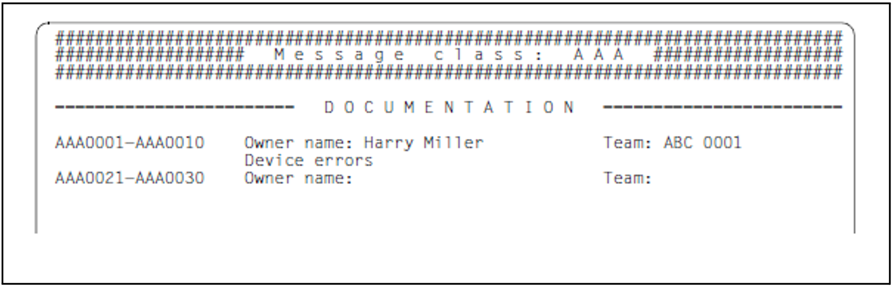 //MODIFY-DOCUMENTATION - MSG-ID=*INTERVAL(FROM=AAA0001,TO=AAA0010),- OWNER=*PARAMETERS(NAME='Harry Miller',TEAM=*UNCHANGED),- COMMENTS='device errors' //MODIFY-DOCUMENTATION - MSG-ID=*INTERVAL(FROM=AAA0021,TO=AAA0030),- OWNER=*PARAMETERS(TEAM=*NONE)