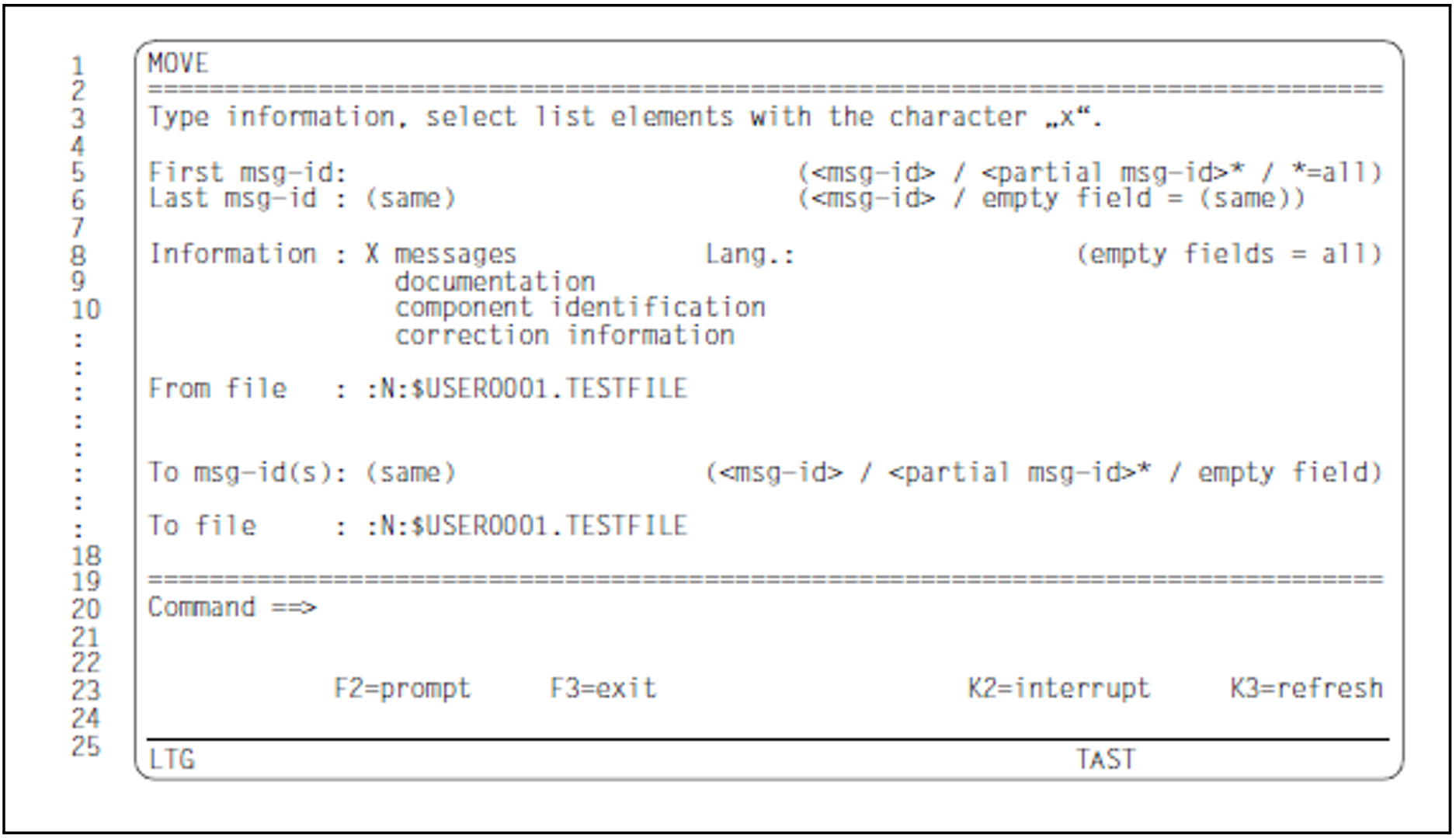 Message units and documentation lines can be selected from the defined message range and copied to another file or to a different location within the same file. Unlike the COPY function, the MOVE function deletes the source area.