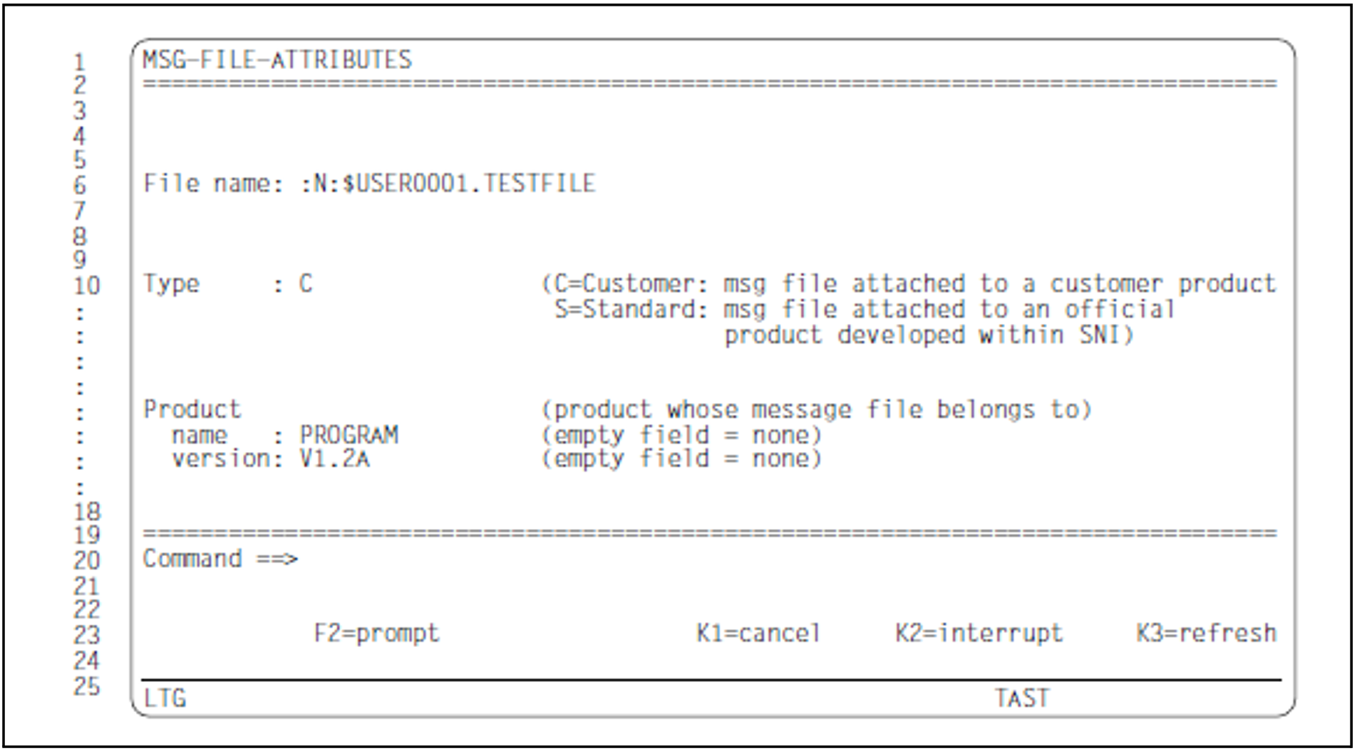 The name entered in the main mask MENU is transferred to the MSG-FILE-ATTRIBUTES mask. This name must not be modified.
