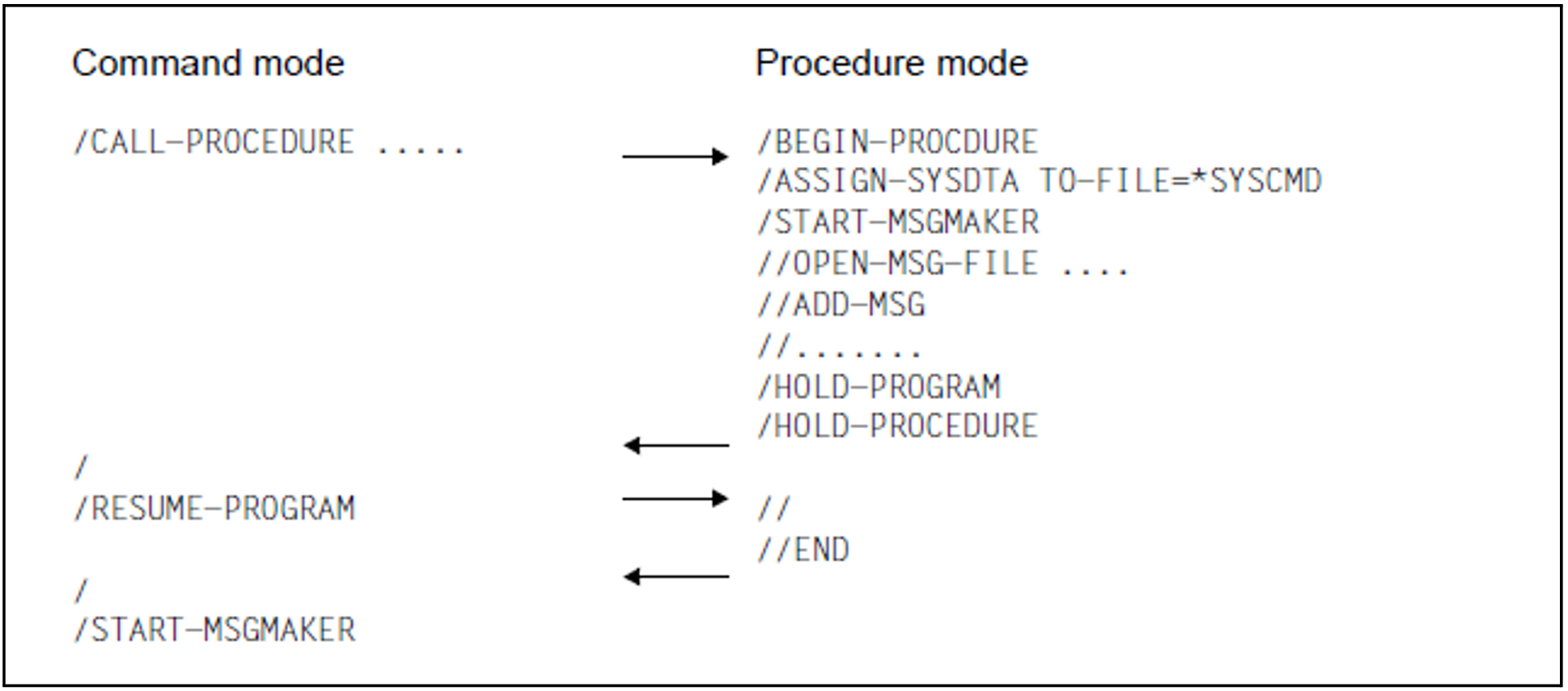 If you return to the routine using /RESUME-PROGRAM, MSGMAKER waits for a statement to be input (you are shown the prompt //). You are back in guided dialog. Although procedure mode is no longer active, this does not change the fact that the routine has been called in a procedure.