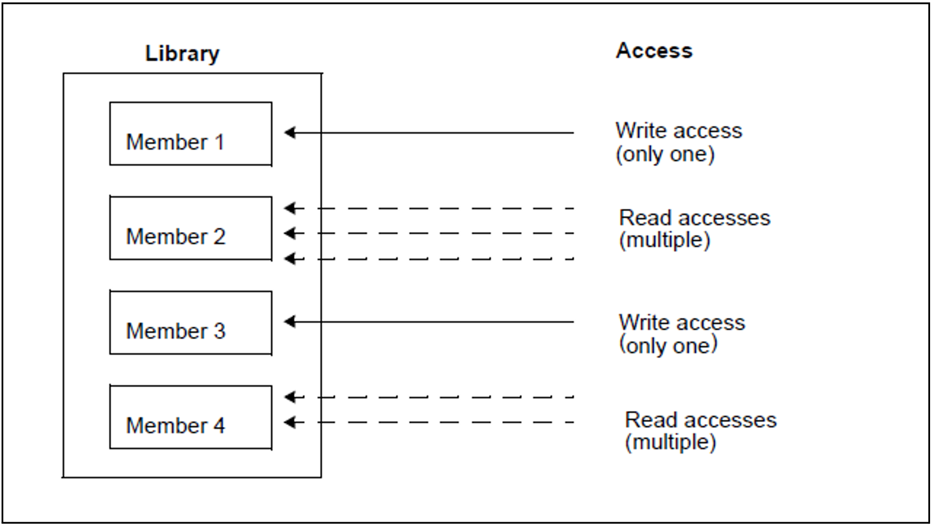 A member can be read simultaneously by several users; it can, however, be written to by one user only. When the member has been opened for writing, no other access - including read access - to this member can be performed, but access to other members of the library is possible.
