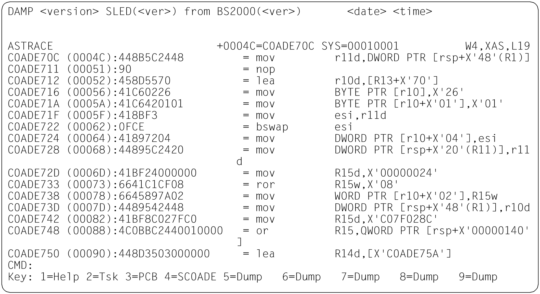 If “ASS” is entered, DAMP automatically determines via the CSECT attribute whether /390 or x86 instructions are to be output. You can, however, also determine the format of the disassembly yourself (e.g. if the CSECT attributes are missing or corrupt). /390 instructions are displayed for the “CAS” entry or x86 instructions for “XAS”.
