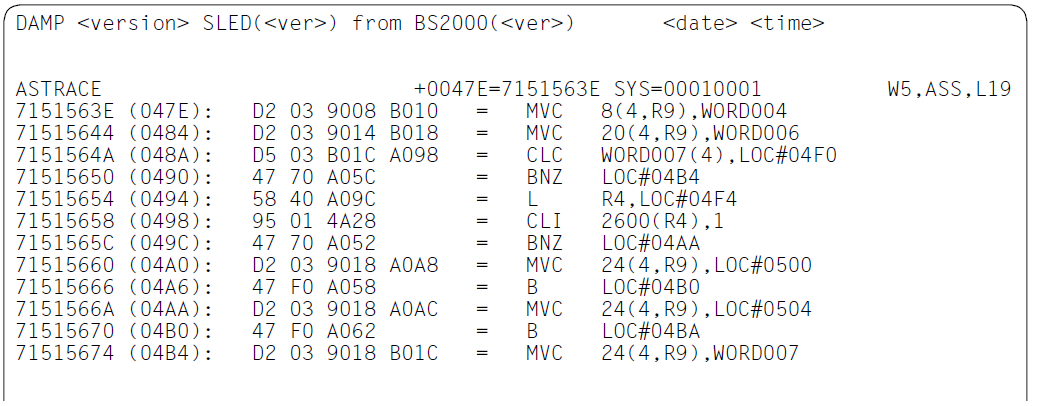 The /390 instruction format used for disassembly is selected automatically by DAMP on the basis of the CPU series used. The MODIFY-OBJECT-ASSUMPTIONS statement can be used to change this preset value. Instruction formats 1 to 5 are available (see the description of the MODIFY-OBJECT-ASSUMPTIONS statement on "MODIFY-OBJECT-ASSUMPTIONS Modify default settings for diagnosis object").
