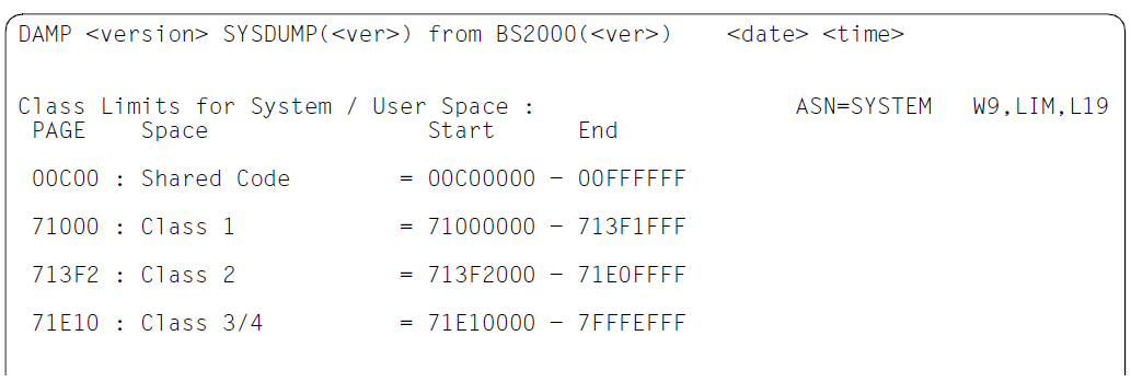 The output of the page attributes contains one line for every 16 pages, and this line, in turn, contains a three-character entry for each page. Depending on the output format selected, these entries contain either a symbolic representation of the attributes of this page (memory class, partial page indicator, privilege indicator) or the original byte from the VAT in hexadecimal format.