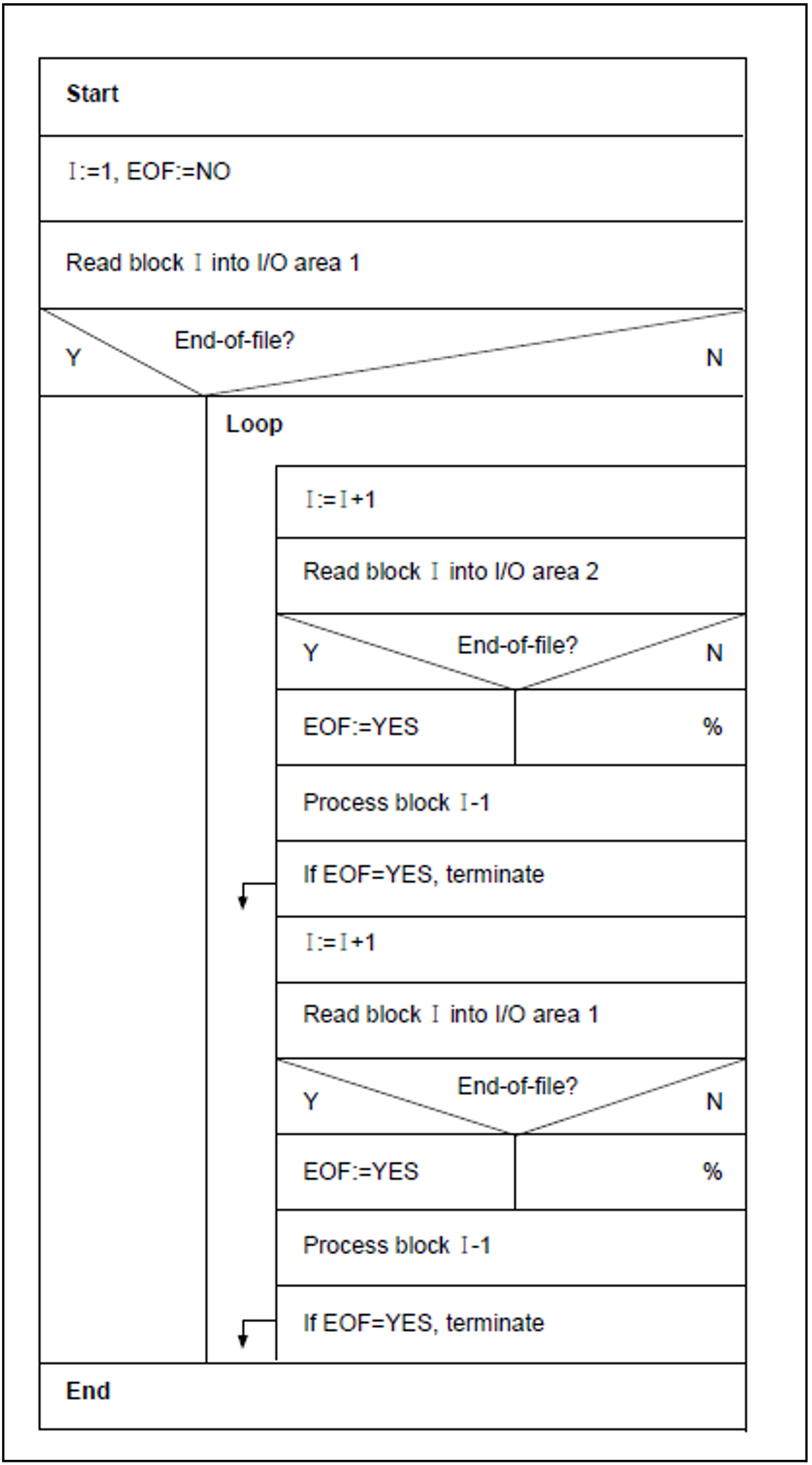 A reduction in processing time can be achieved by means of asynchronous I/O operations. Once an I/O operation has been initiated, control is immediately returned to the program in order to enable other processing to take place in parallel with the physical I/O. The next I/O operation is then initiated using a second I/O area that does not overlap the first, and so on.