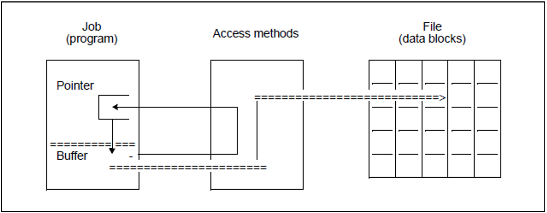 The basis of file processing is the record. However, data blocks are still transferred between the peripheral device and the buffer area. DMS handles the necessary blocking and deblocking of records and makes the required records available to the user program. If the record required by a read operation is not in the buffer, or if a write operation fails because the buffer is full, a data transfer is initiated: DMS reads the next data block or writes the buffer contents as a new data block, respectively.