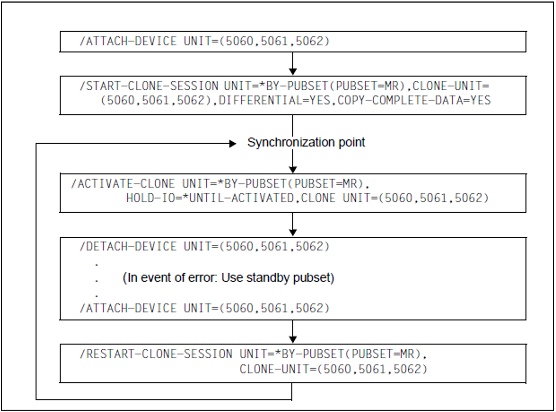 This generates the standby pubset which can be used if a fault occurs.Reattach the disks of the standby pubset (ATTACH-DEVICE command).