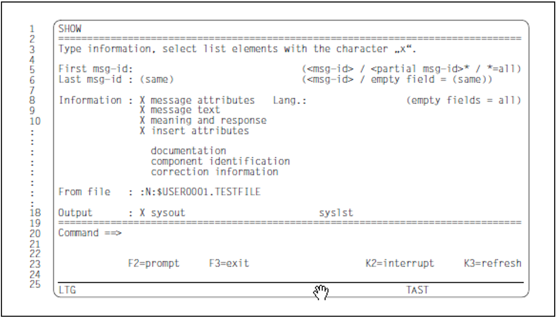 This mask allows the user to select message file components by specifying the message code and output them to SYSOUT or to a SYSLST file. The message units are displayed classified according to their attributes, their message, meaning and response texts in the specified languages and their insert attributes. Documentation lines may also be displayed. These message file components are sorted according to message class. A separate mask is used for output to SYSOUT (see "SHOW-OUTPUT mask - Output message units and additional information", SHOW-OUTPUT mask).